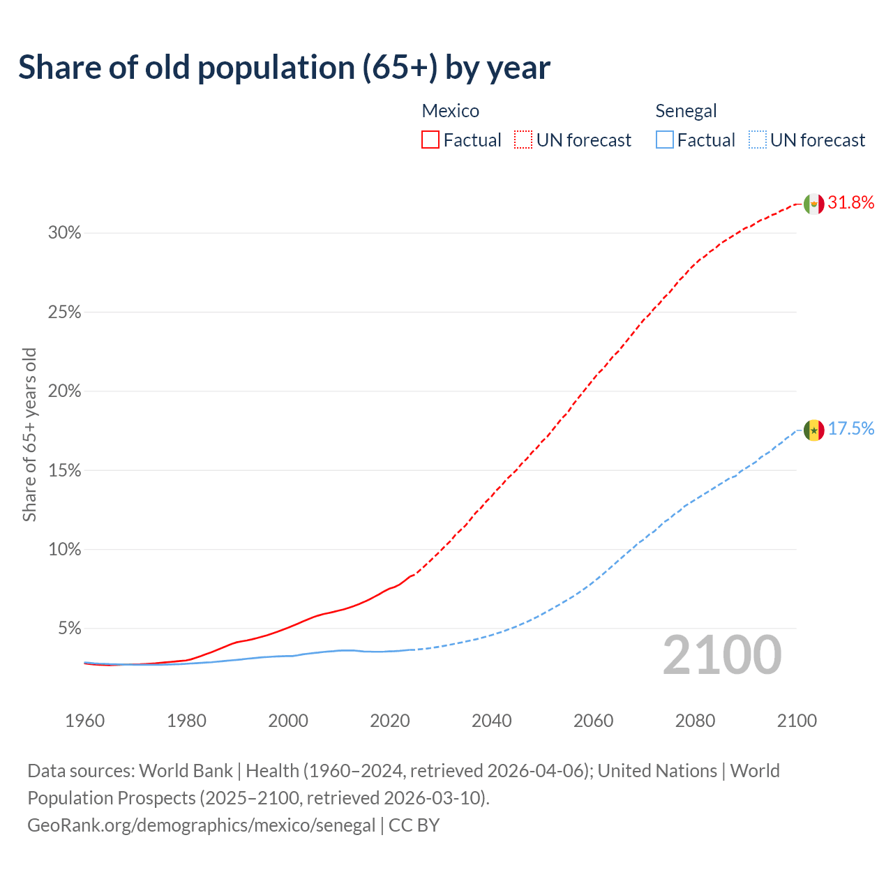The share of older people aged 65 and over is 8.25% in Mexico and 3.62% in Senegal. Life expectancy in Mexico compared to Senegal .