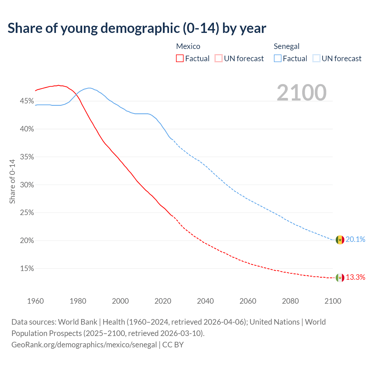 - The share of young demographic (0-15 years old) in Mexico is 24.5% vs 38.2% in Senegal.