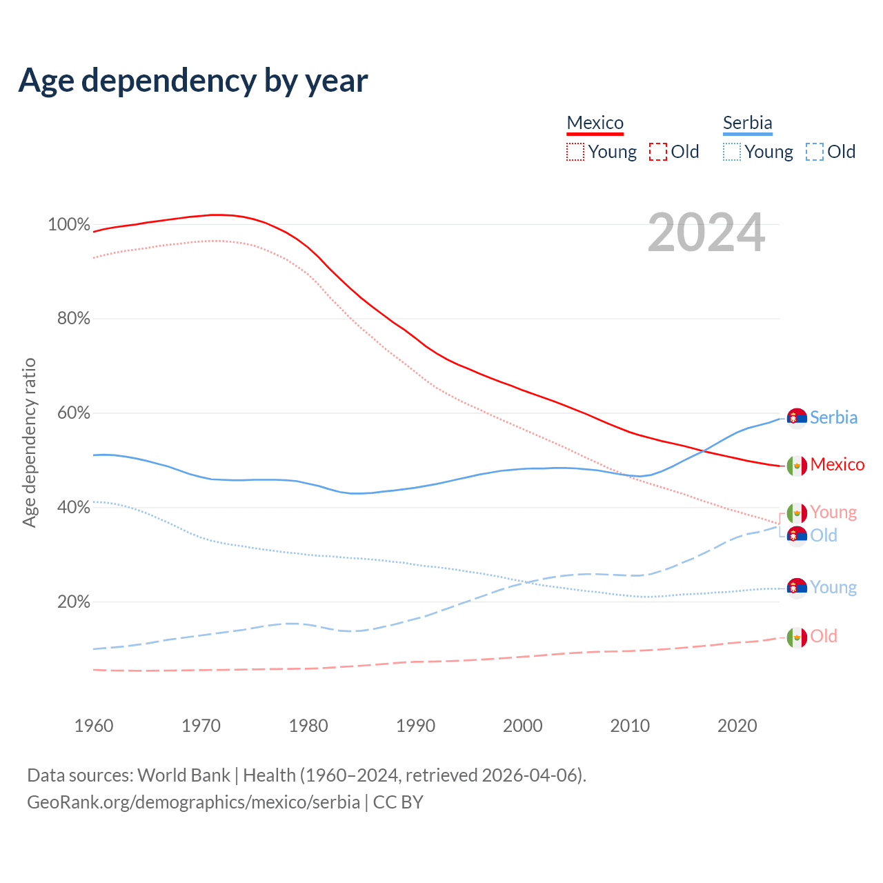 - Mexico is ranked 102/196 by median age (oldest to youngest) vs 15/196 for Serbia.