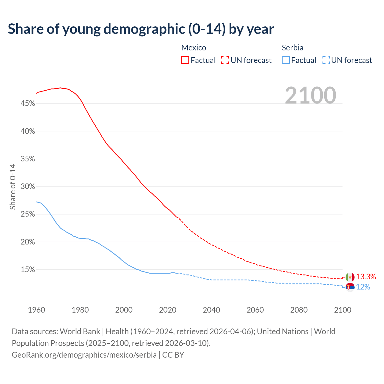 - The share of young demographic (0-15 years old) in Mexico is 24.5% vs 14.3% in Serbia.