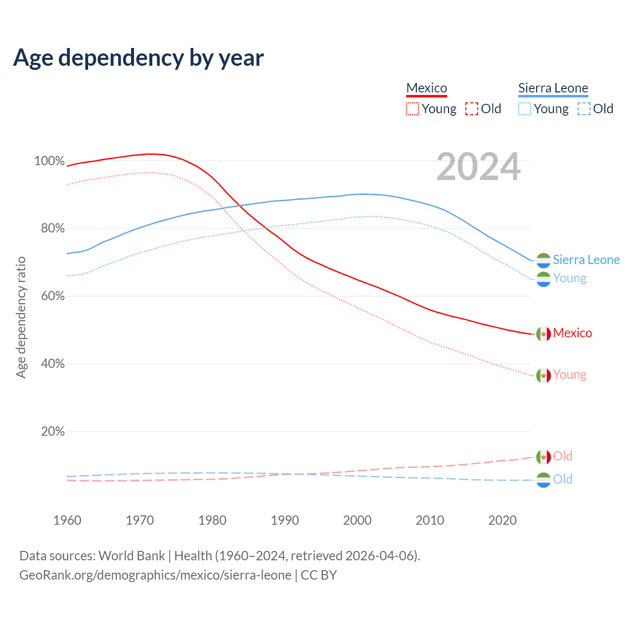 - The share of old-age demographic (65+) in Mexico is 8.25% vs 3.24% in Sierra Leone.