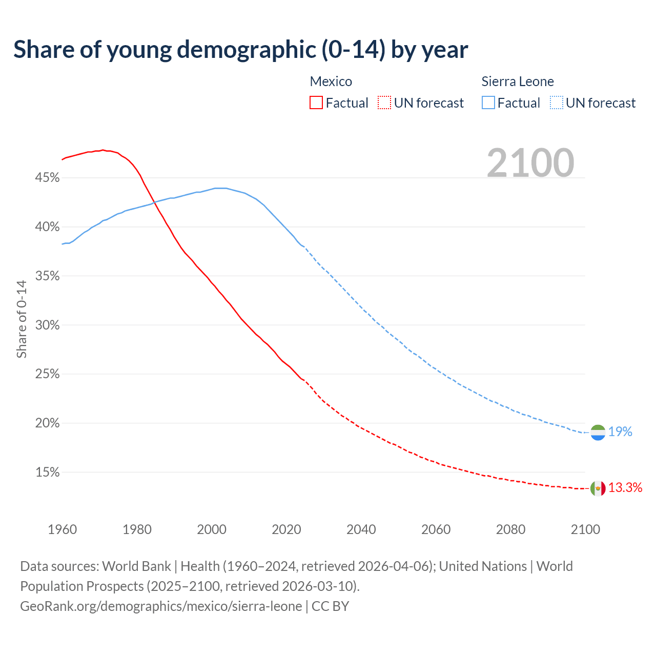 - The share of young demographic (0-15 years old) in Mexico is 24.5% vs 38.1% in Sierra Leone.