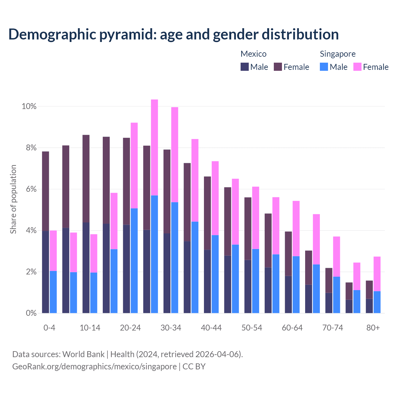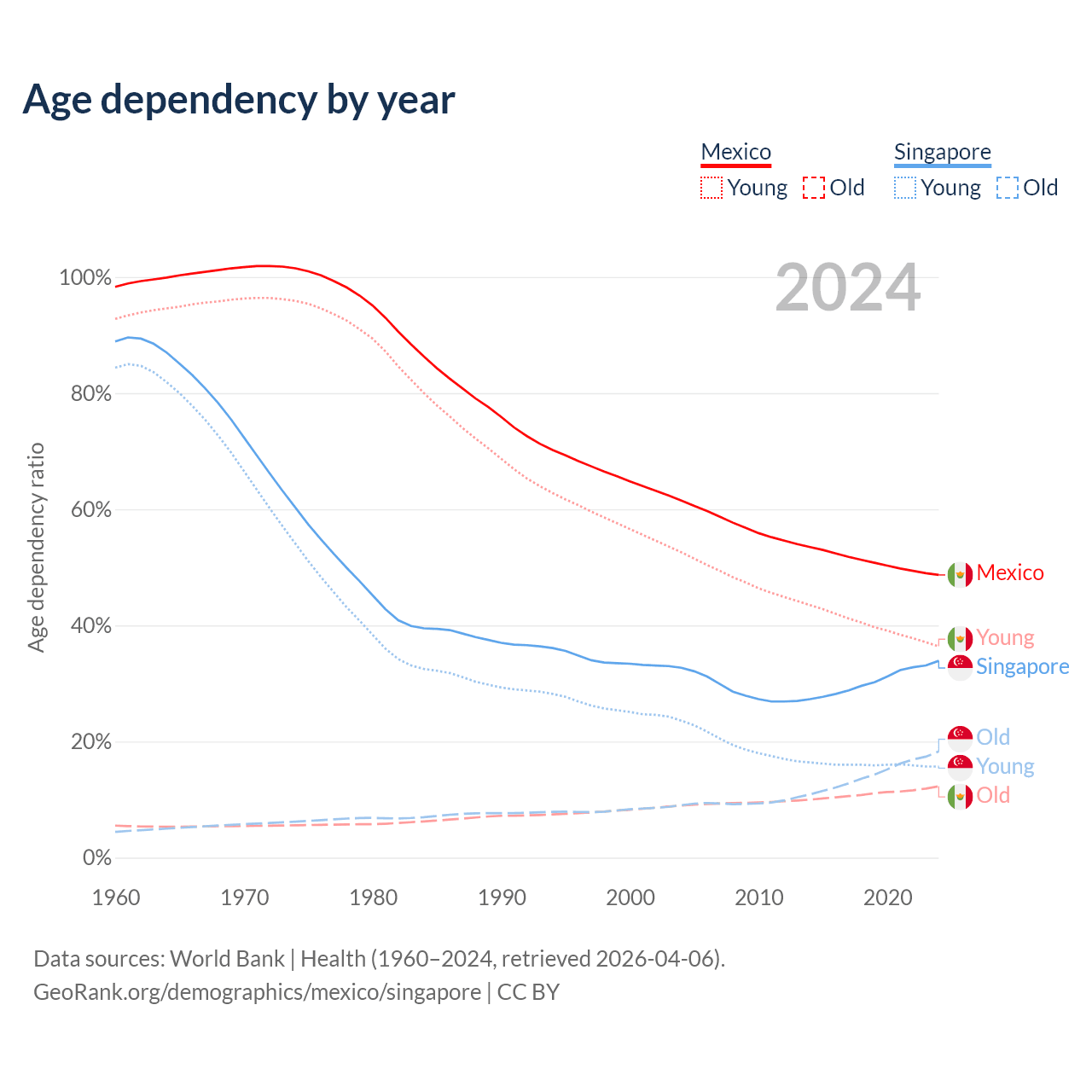 - Mexico is ranked 102/196 by median age (oldest to youngest) vs 68/196 for Singapore.