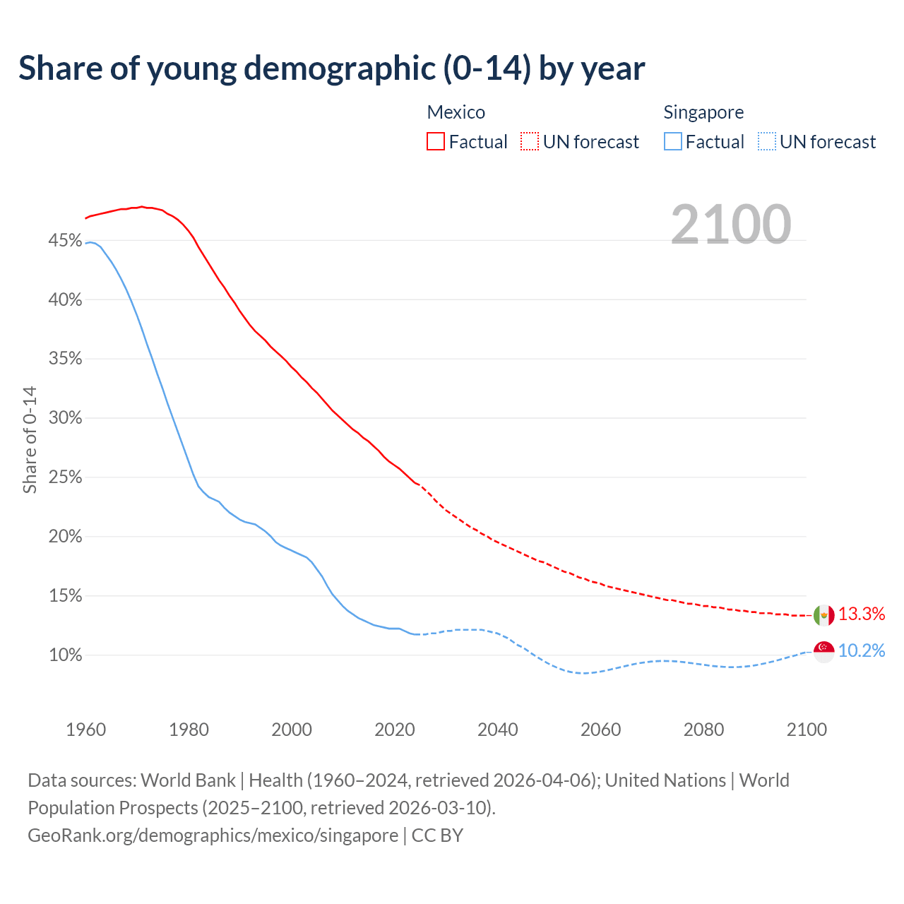 - The share of young demographic (0-15 years old) in Mexico is 24.5% vs 11.7% in Singapore.
