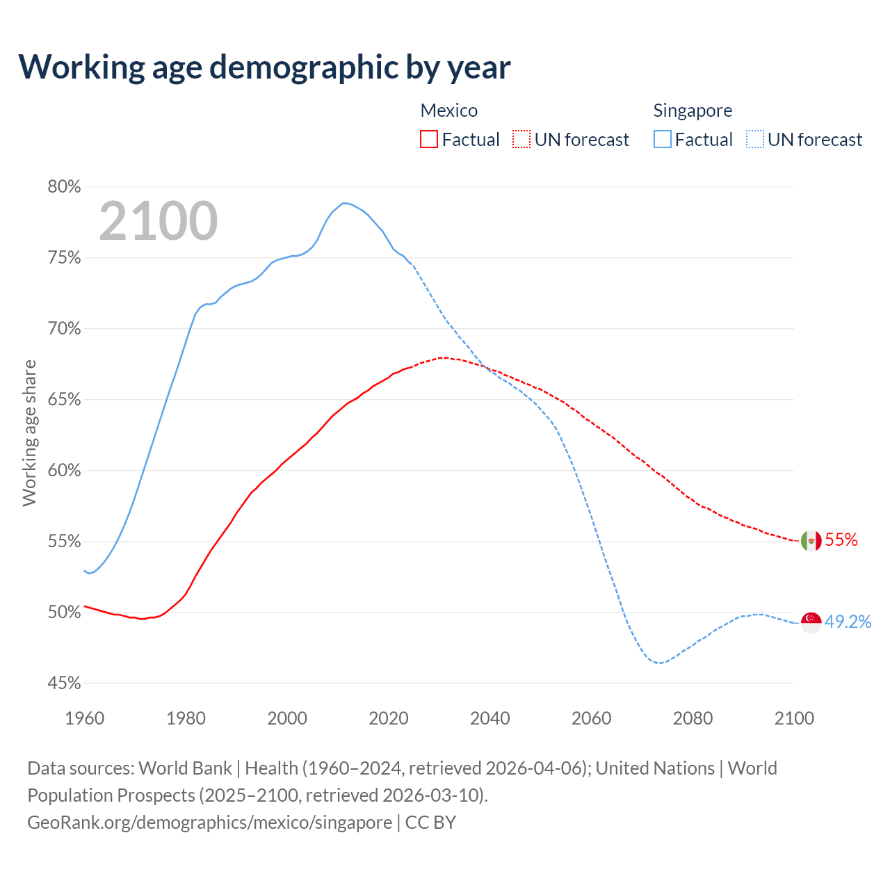 Median age Mexico vs Singapore, 1960-2100