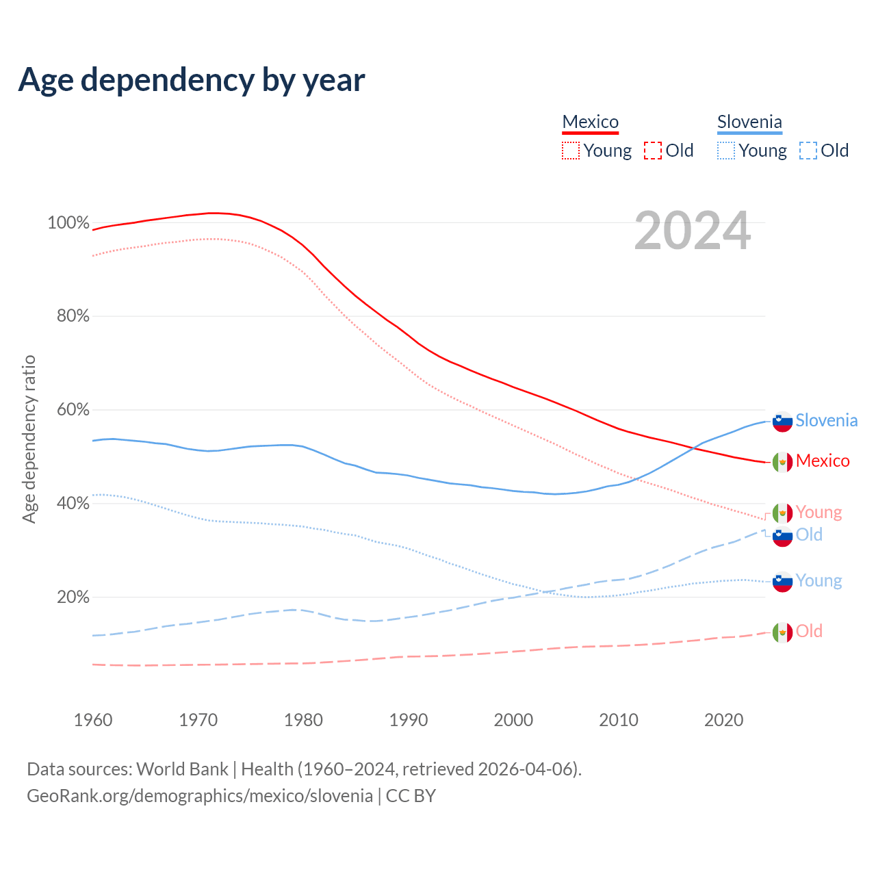 - Mexico is ranked 102/196 by median age (oldest to youngest) vs 14/196 for Slovenia.
