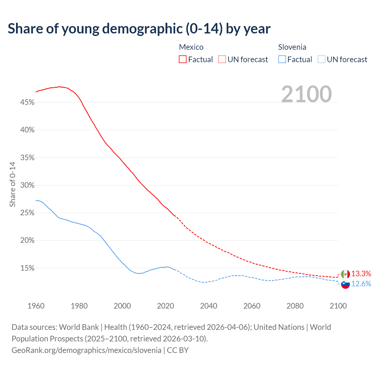 - The share of young demographic (0-15 years old) in Mexico is 24.5% vs 14.7% in Slovenia.