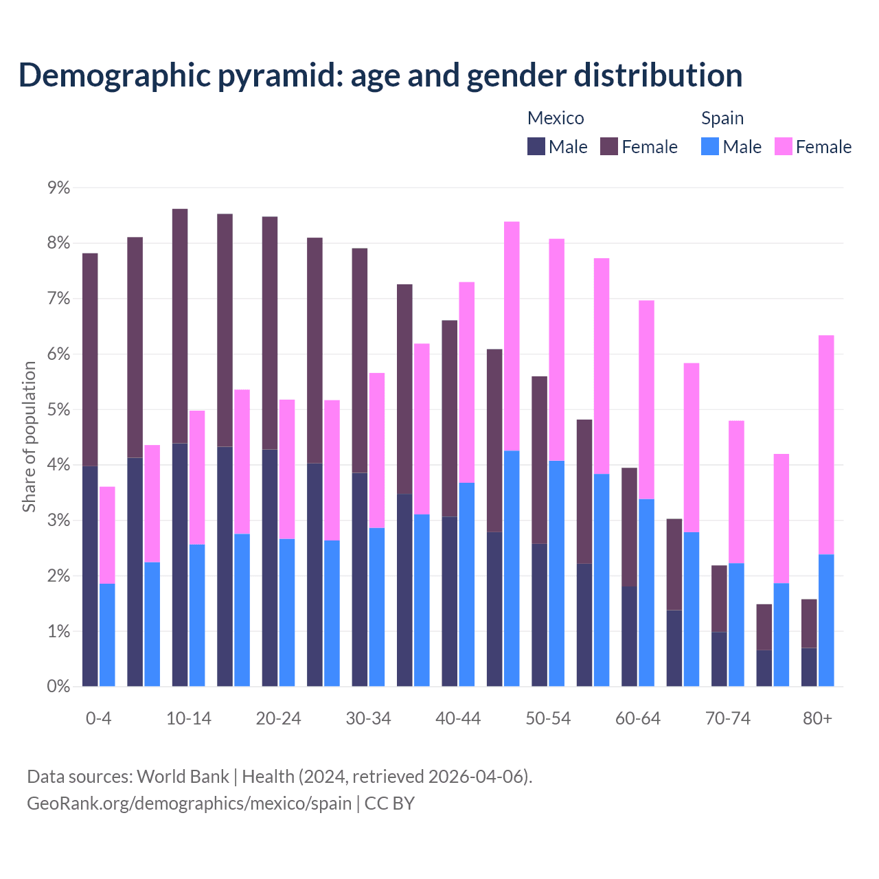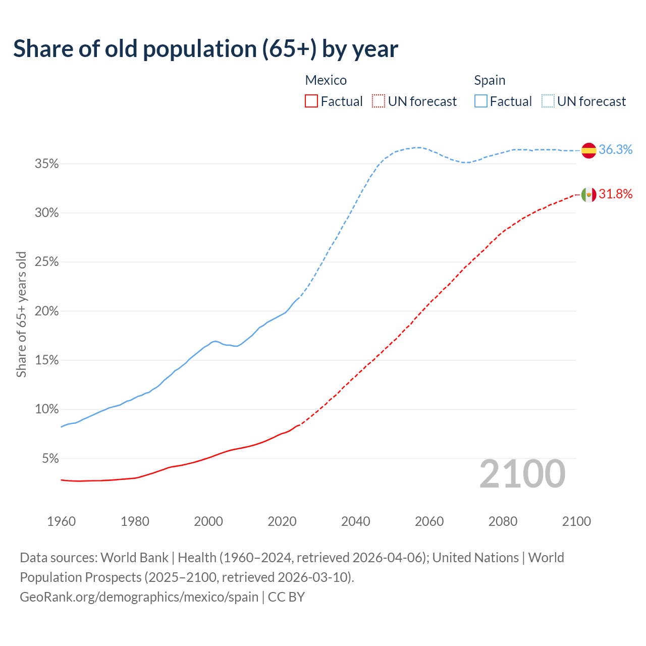 The share of older people aged 65 and over is 8.25% in Mexico and 21.1% in Spain. Life expectancy in Mexico compared to Spain .