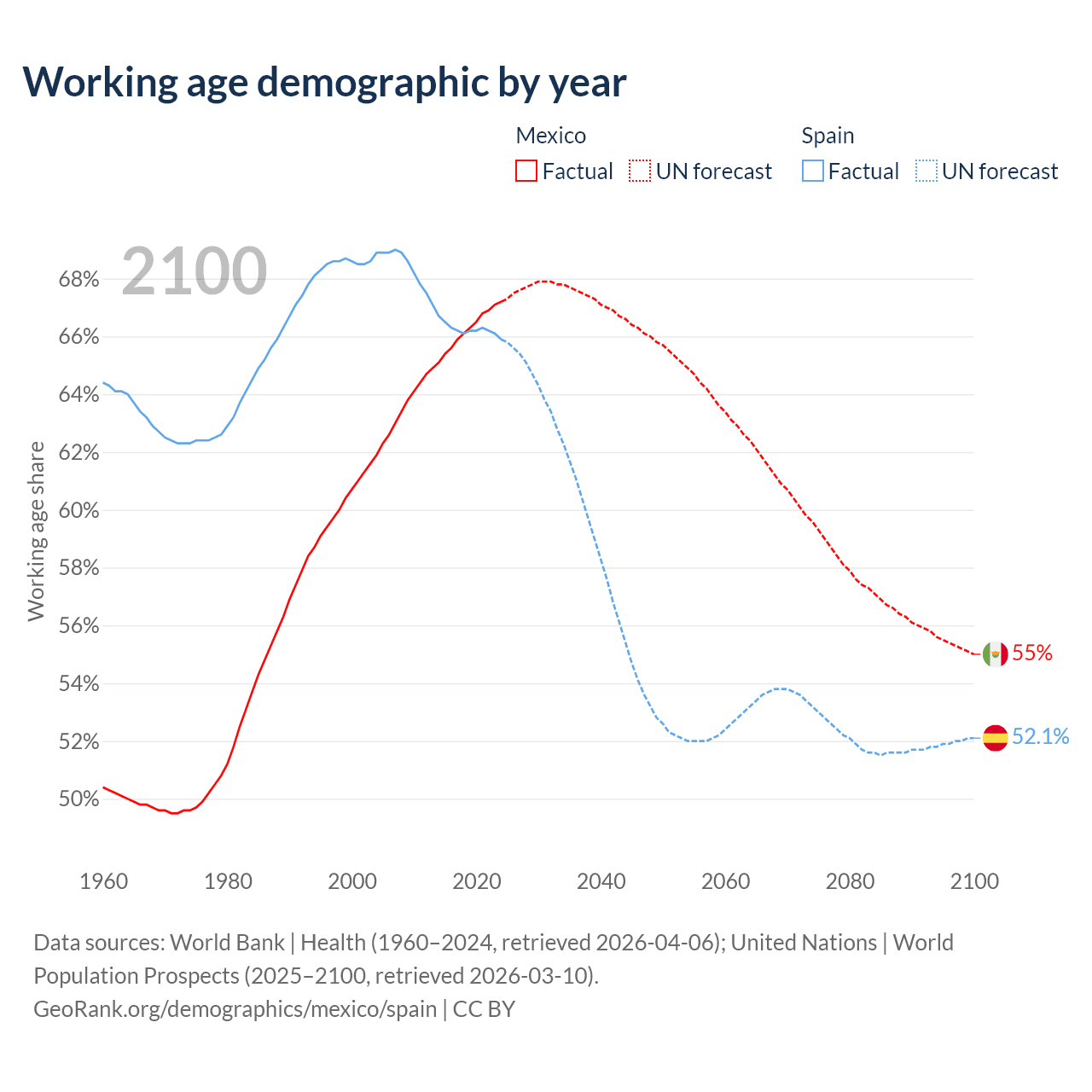 Median age Mexico vs Spain, 1960-2100