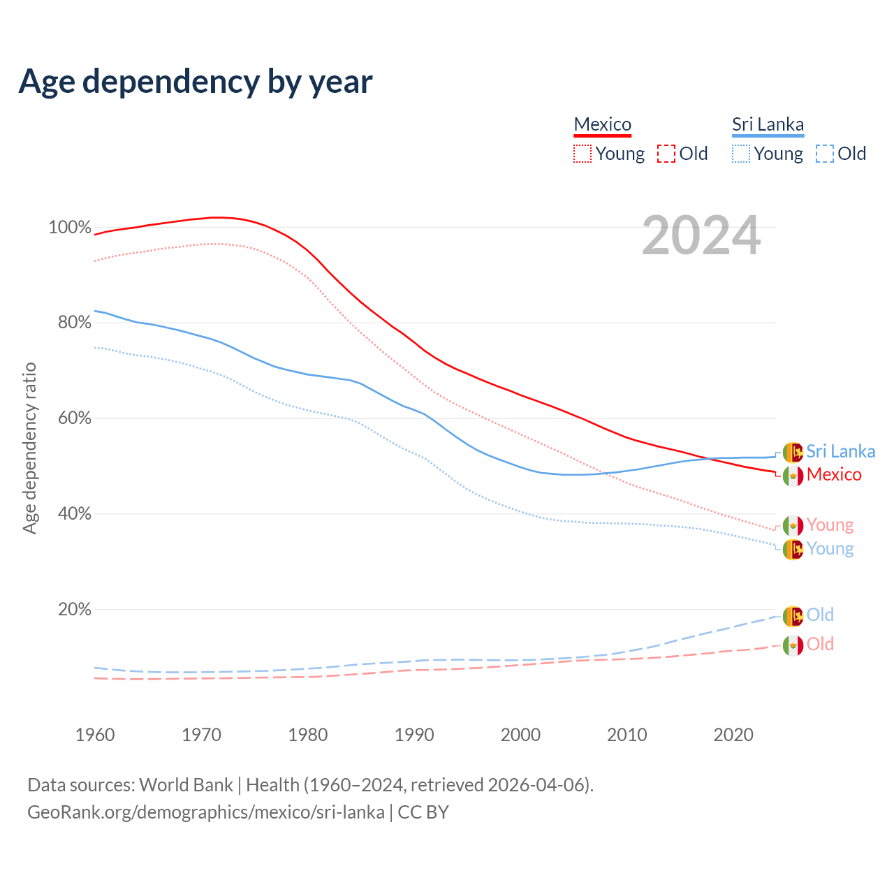 - Mexico is ranked 102/196 by median age (oldest to youngest) vs 81/196 for Sri Lanka.