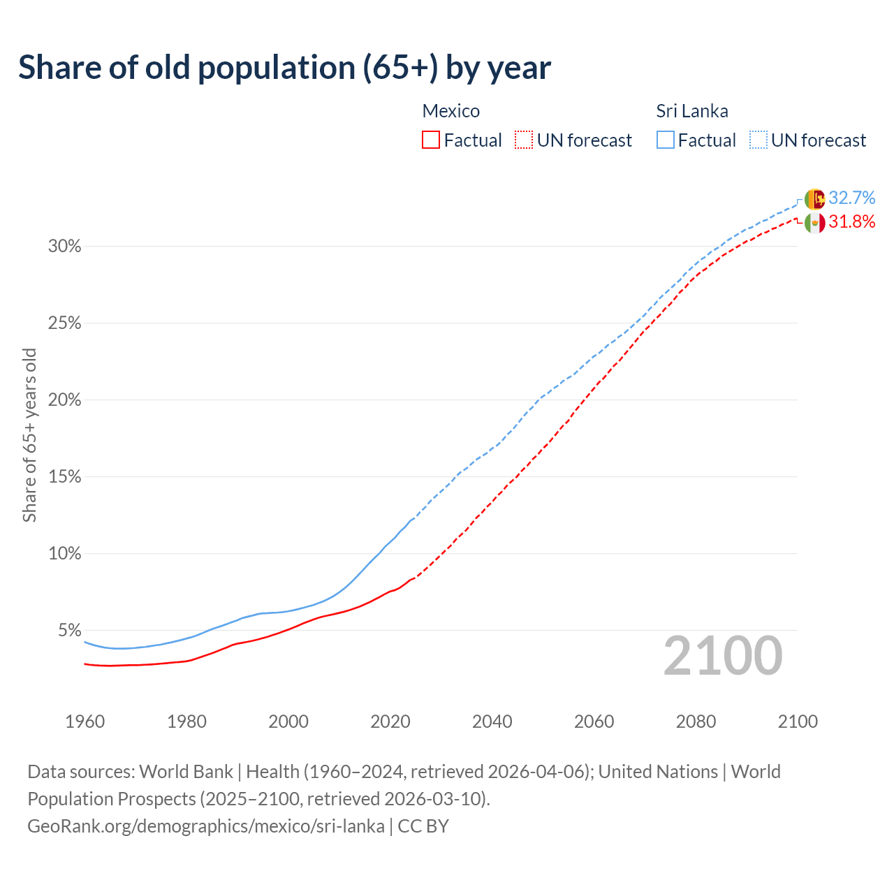 The share of older people aged 65 and over is 8.25% in Mexico and 12.1% in Sri Lanka. Life expectancy in Mexico compared to Sri Lanka .