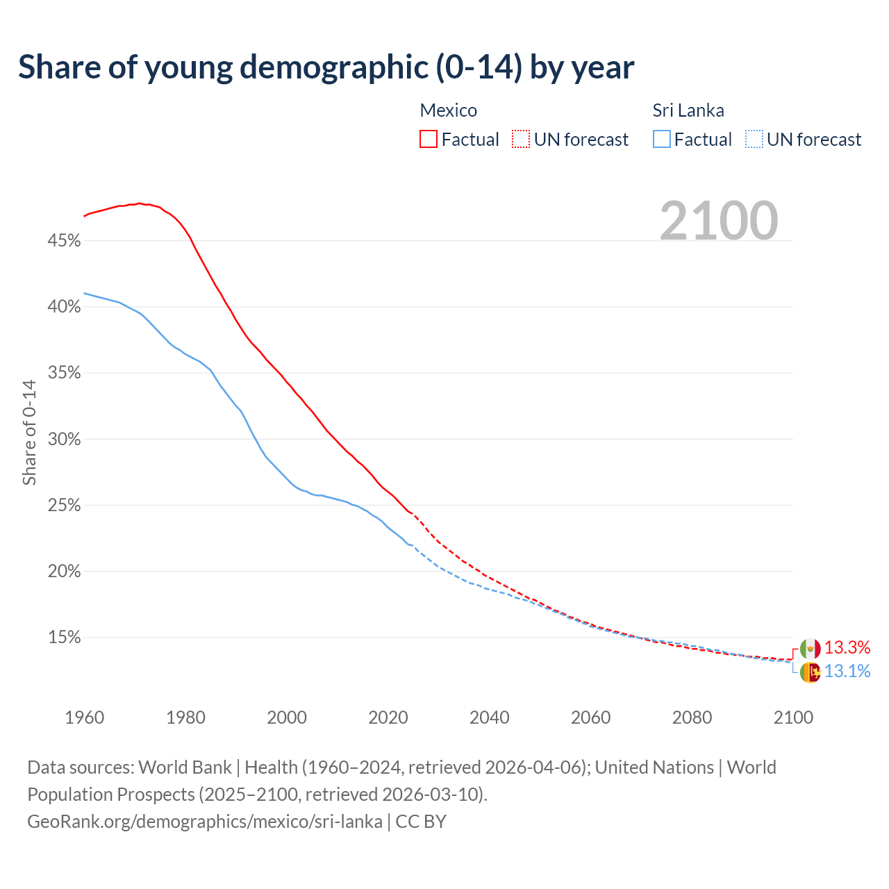 - The share of young demographic (0-15 years old) in Mexico is 24.5% vs 22% in Sri Lanka.