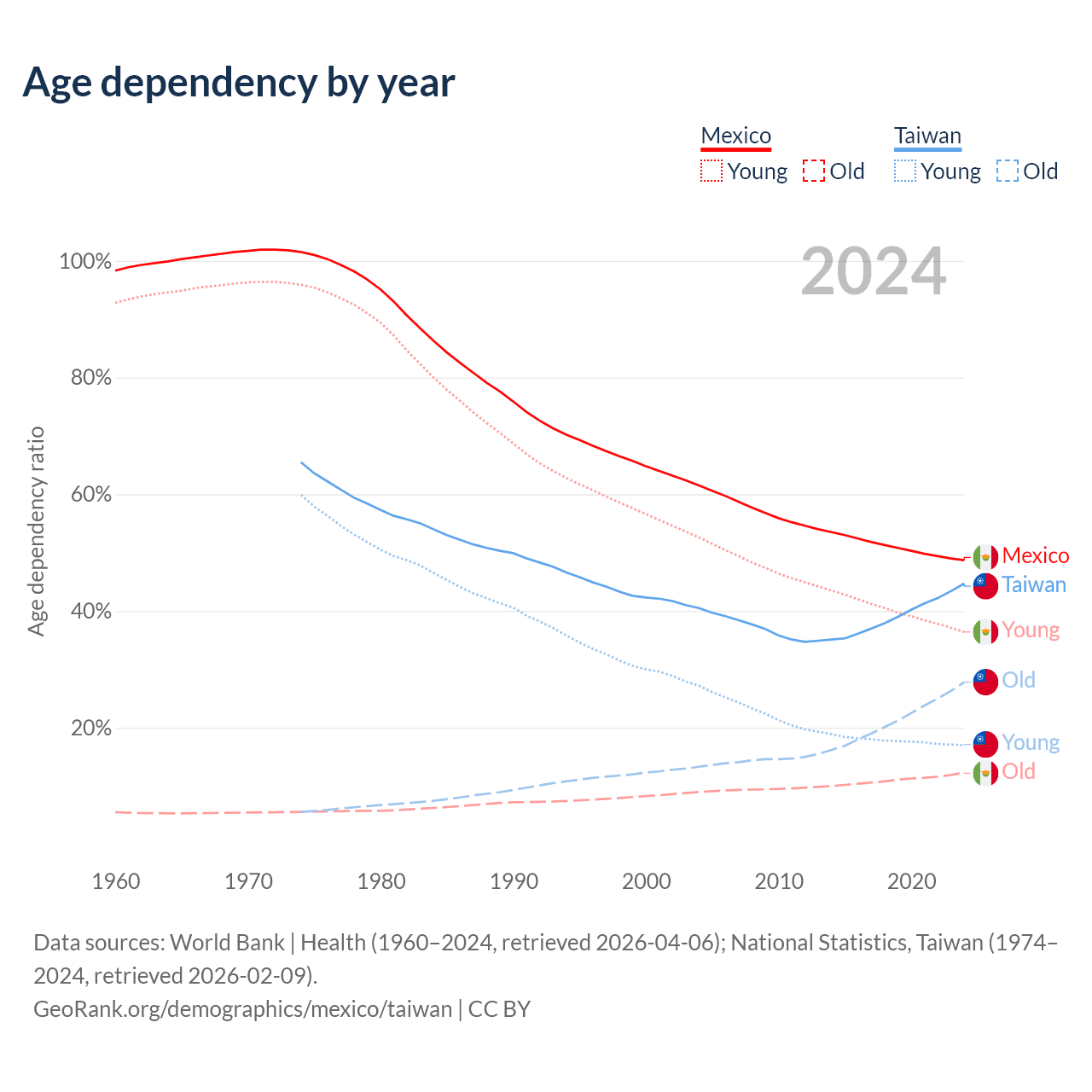 Data sources: World Bank | Health (1960–2024, retrieved 2026-04-06); U.S. Census Bureau (1960–2024, retrieved 2026-02-08); National Statistics, Taiwan (1974–2024, retrieved 2026-02-09).