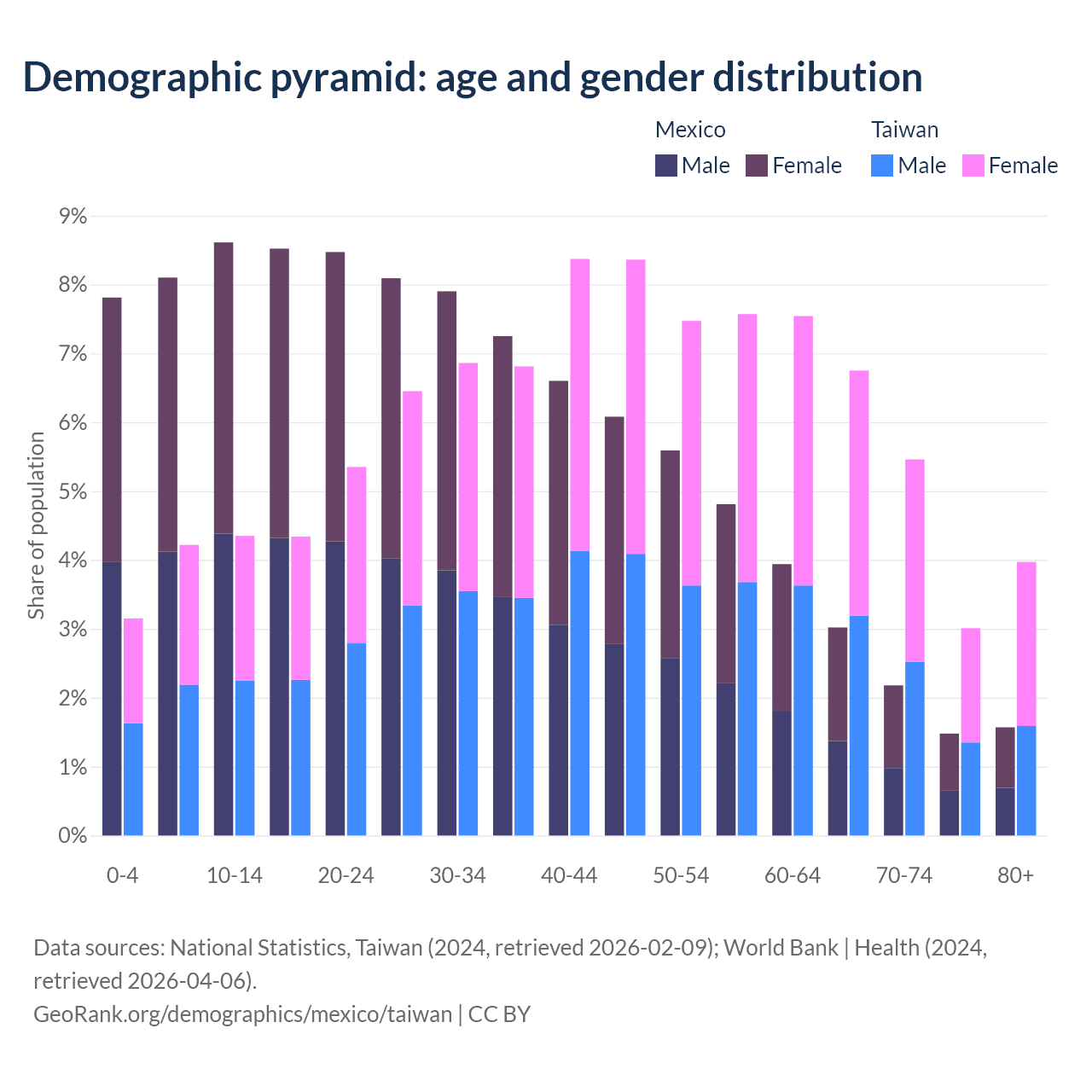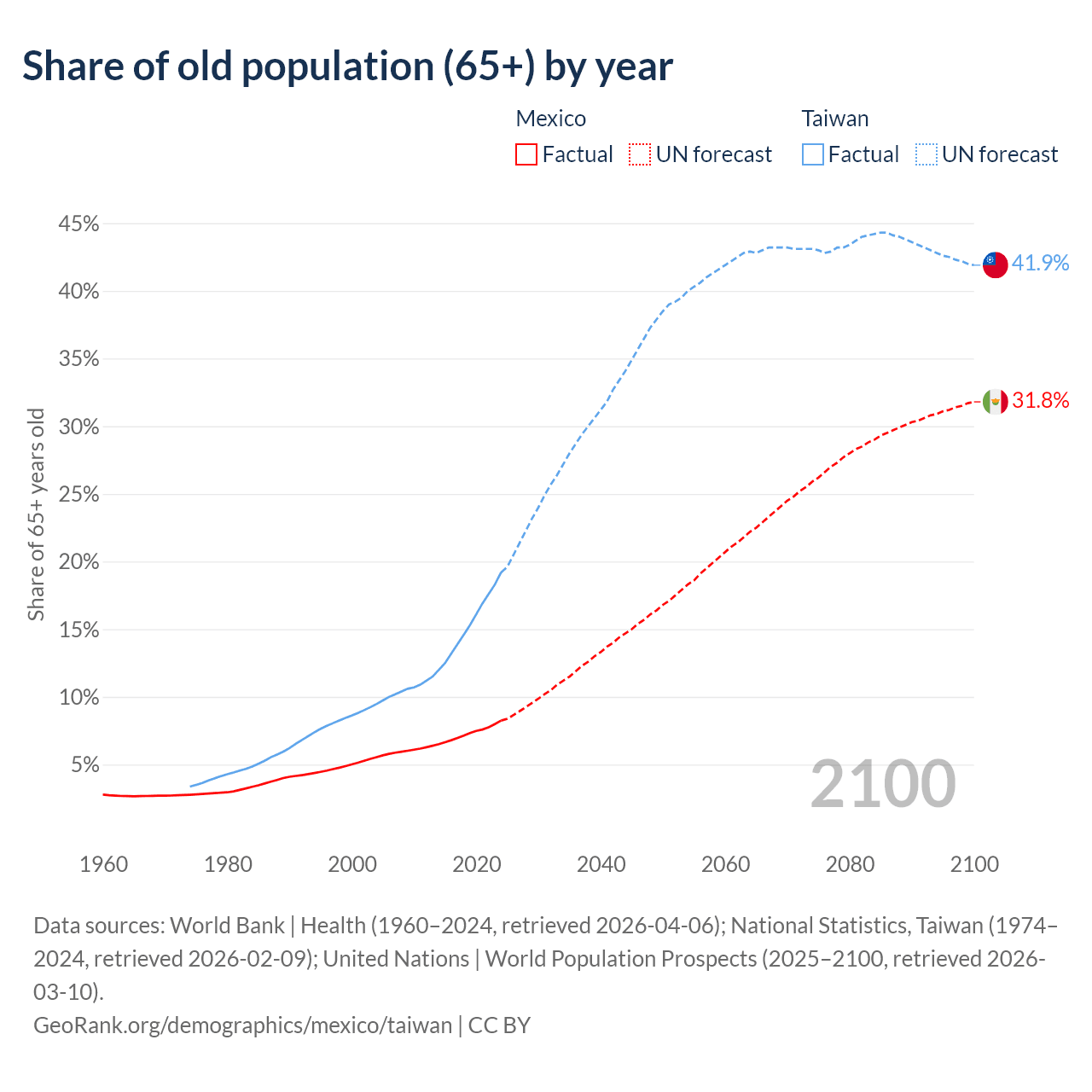 The share of older people aged 65 and over is 8.25% in Mexico and 19.2% in Taiwan. Life expectancy in Mexico compared to Taiwan .