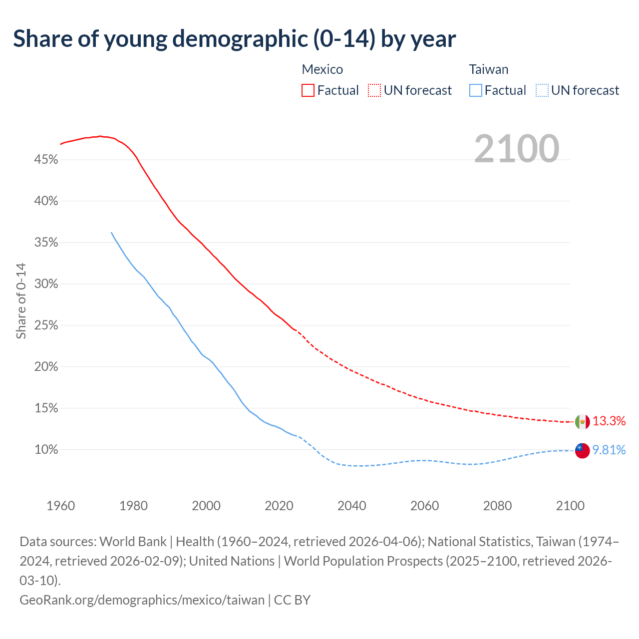 - The share of young demographic (0-15 years old) in Mexico is 24.5% vs 11.7% in Taiwan.