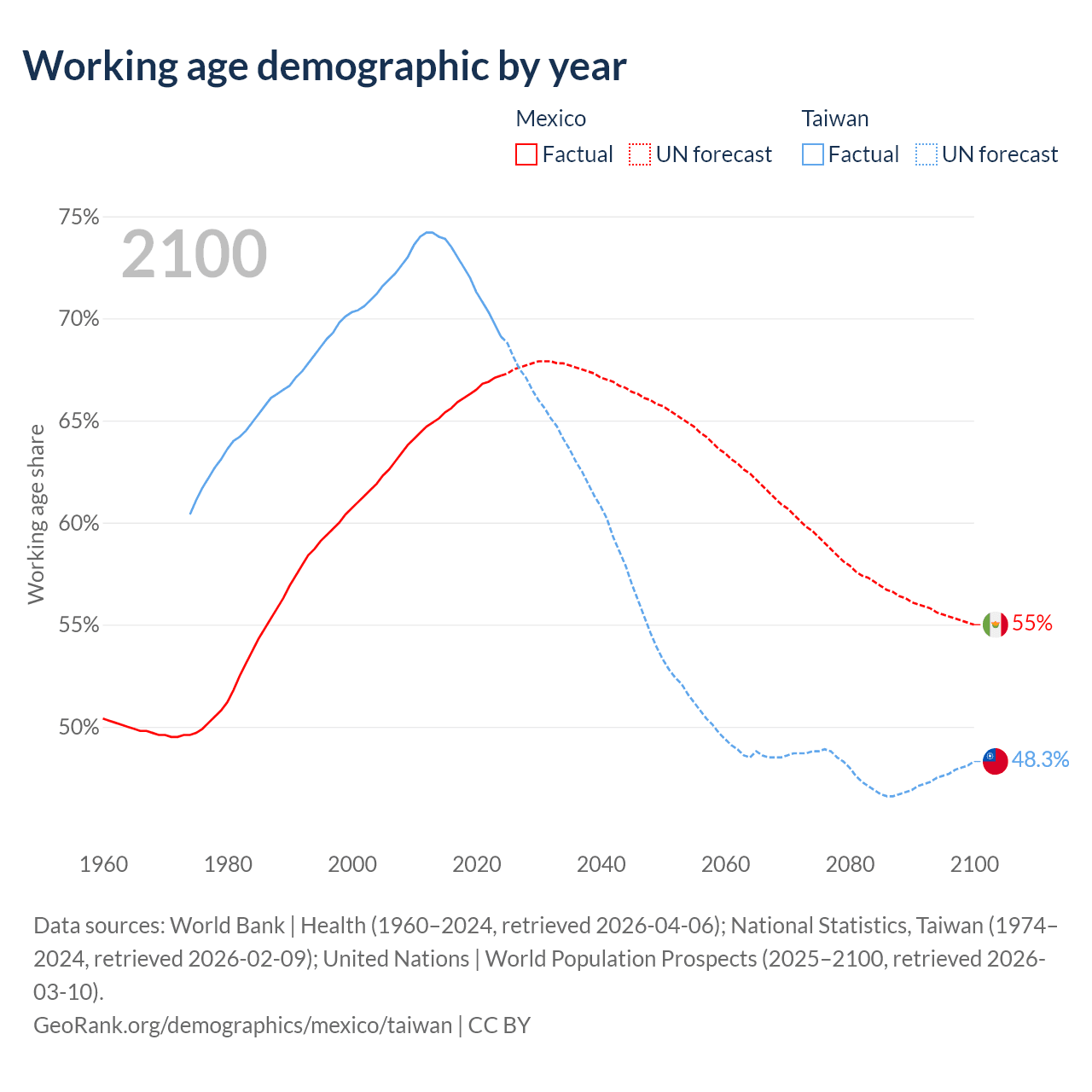 - Mexico has 89.6M working age adults (aged 15-64) vs 16.1M in Taiwan.