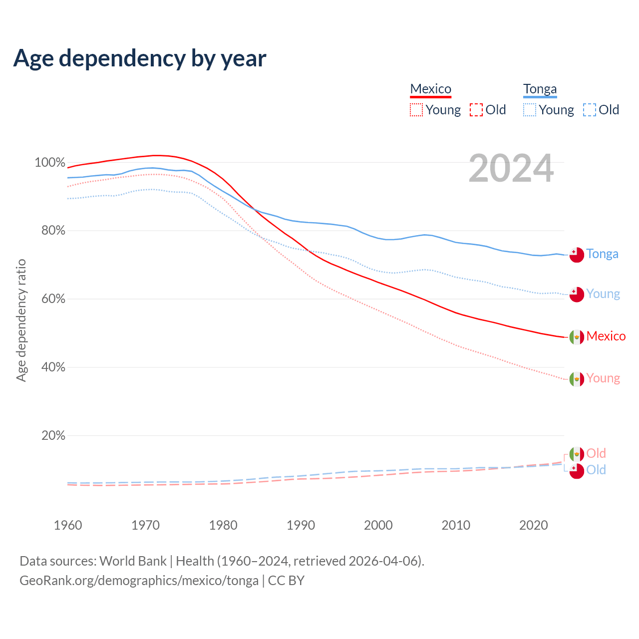 Data sources: World Bank | Health (1960–2024, retrieved 2026-04-06); U.S. Census Bureau (1960–2024, retrieved 2026-02-08).