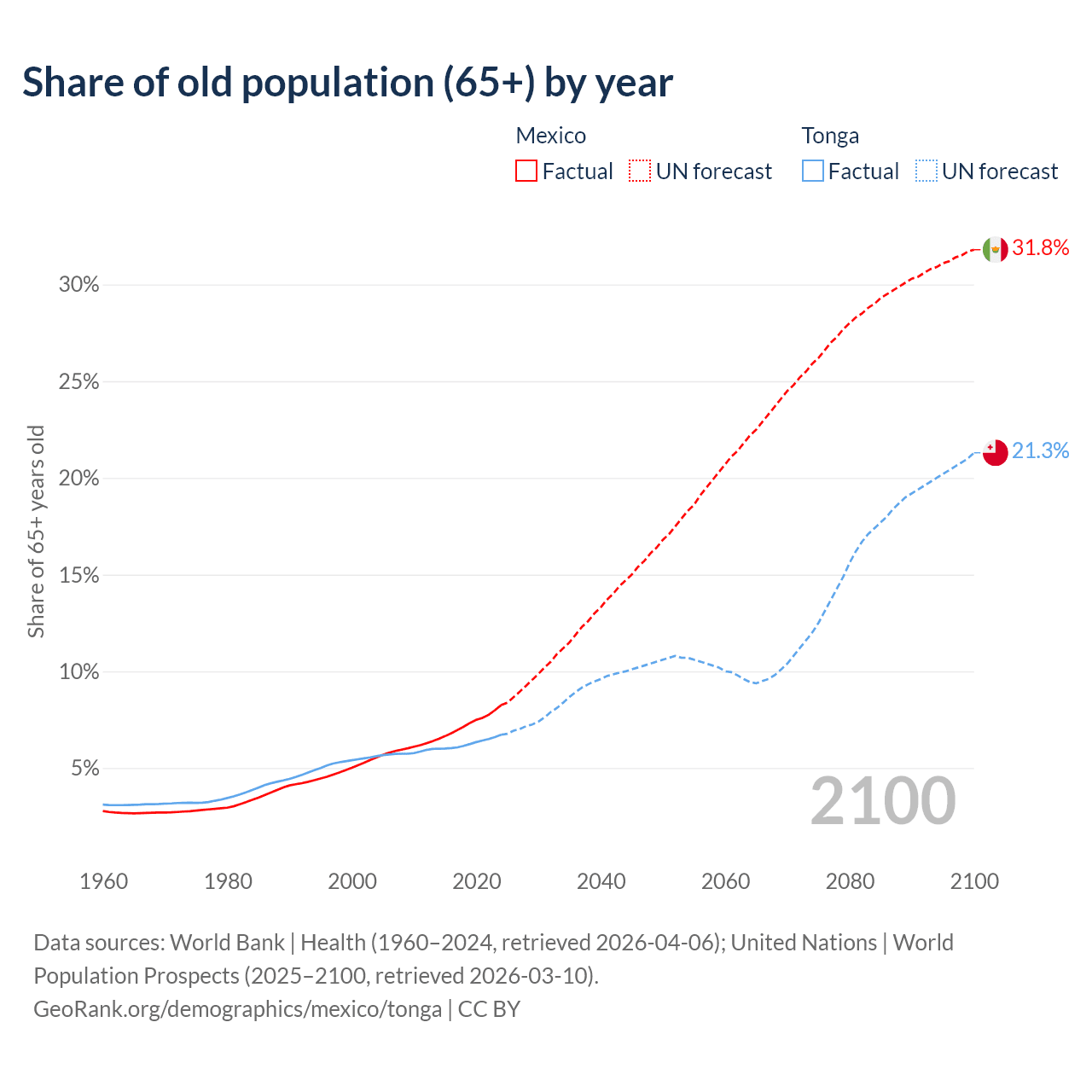 The share of older people aged 65 and over is 8.25% in Mexico and 6.72% in Tonga. Life expectancy in Mexico compared to Tonga .