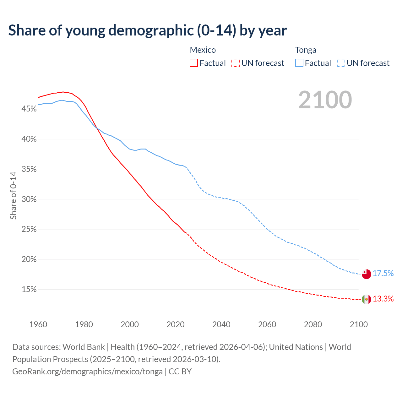- The share of young demographic (0-15 years old) in Mexico is 24.5% vs 35.4% in Tonga.