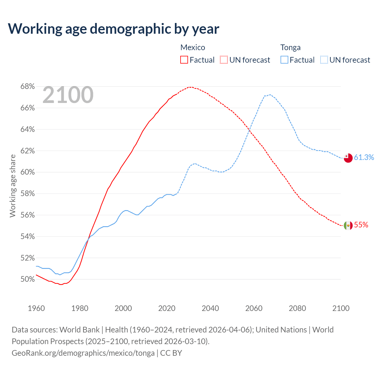 - Mexico has 89.6M working age adults (aged 15-64) vs 59.8K in Tonga.