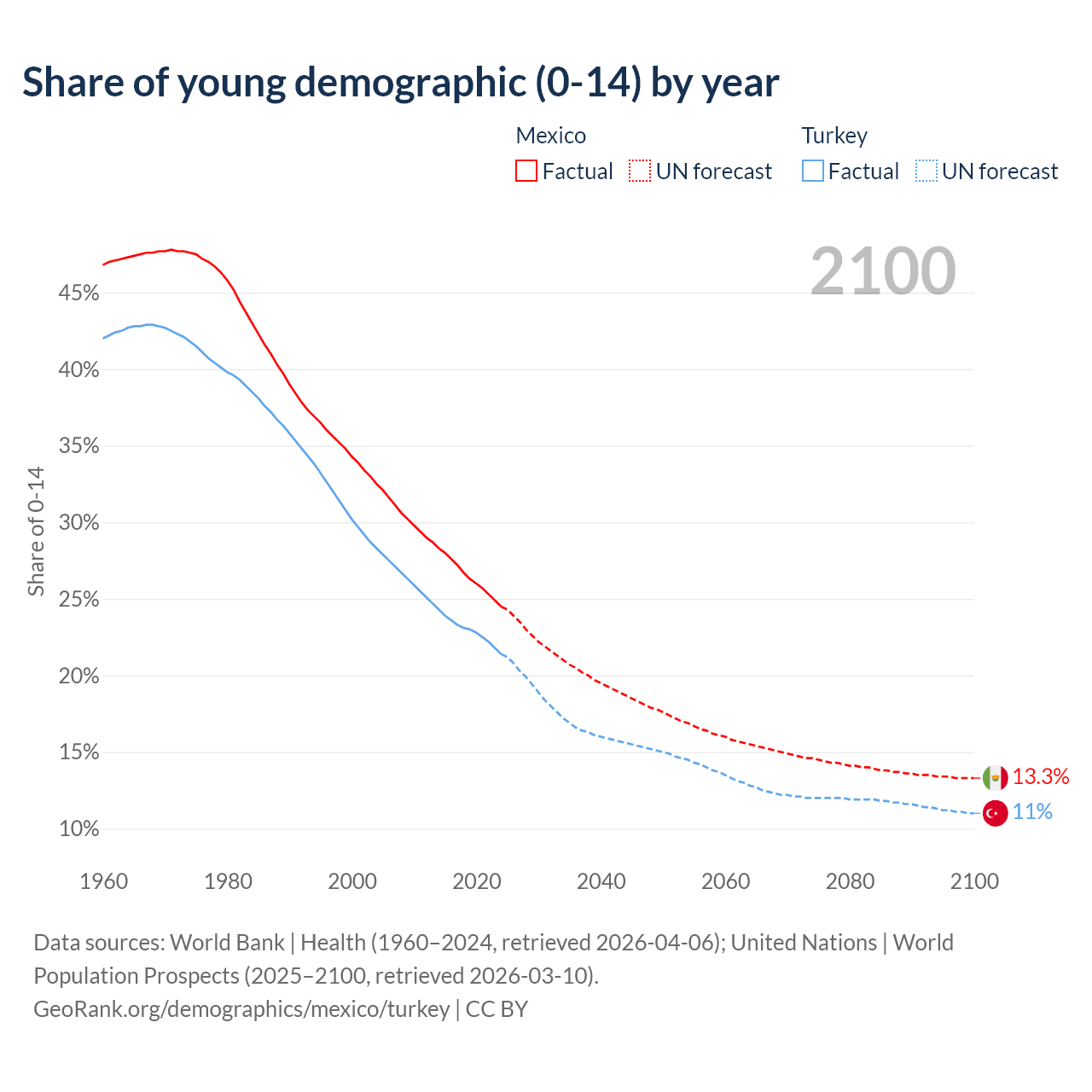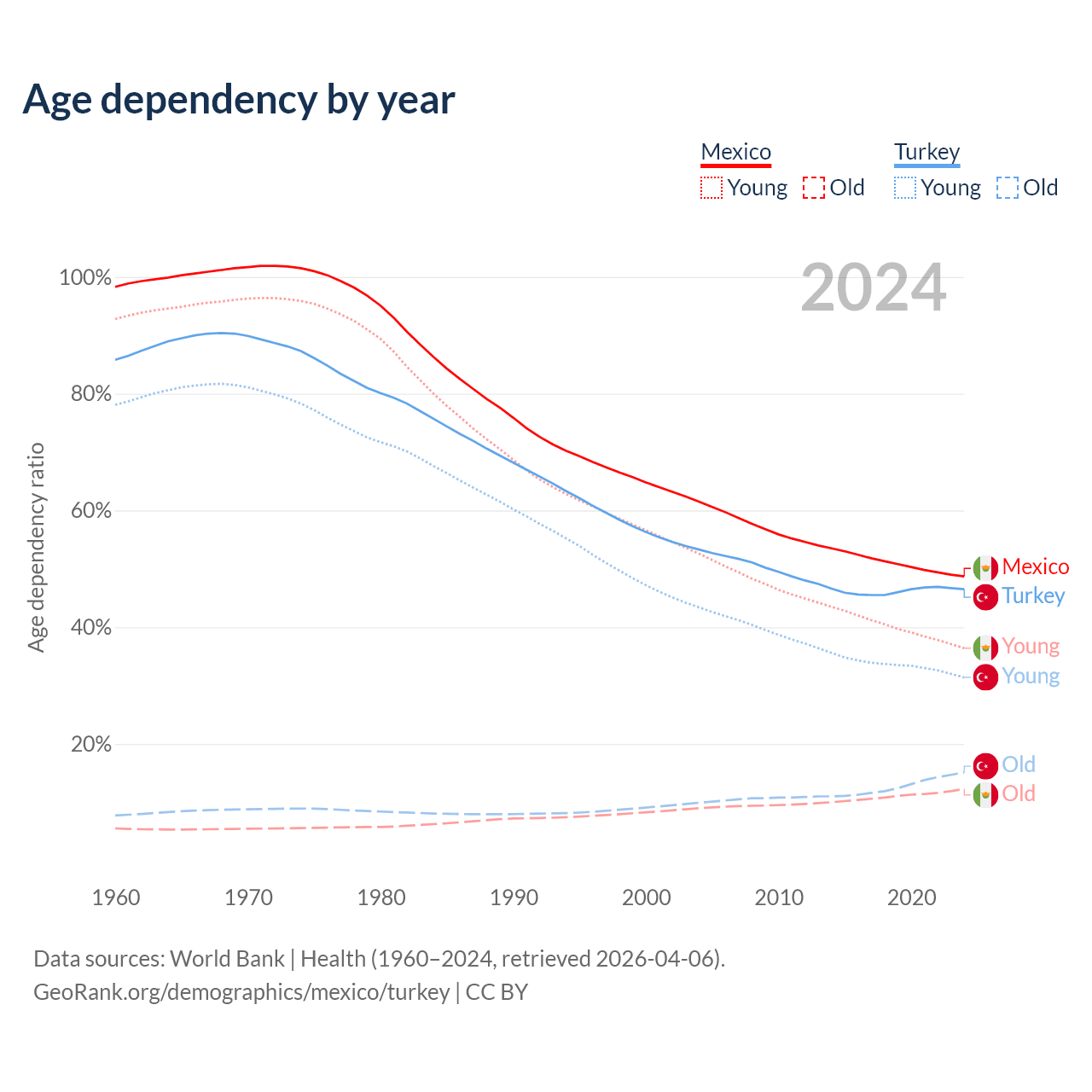 - Mexico is ranked 102/196 by median age (oldest to youngest) vs 83/196 for Turkey.