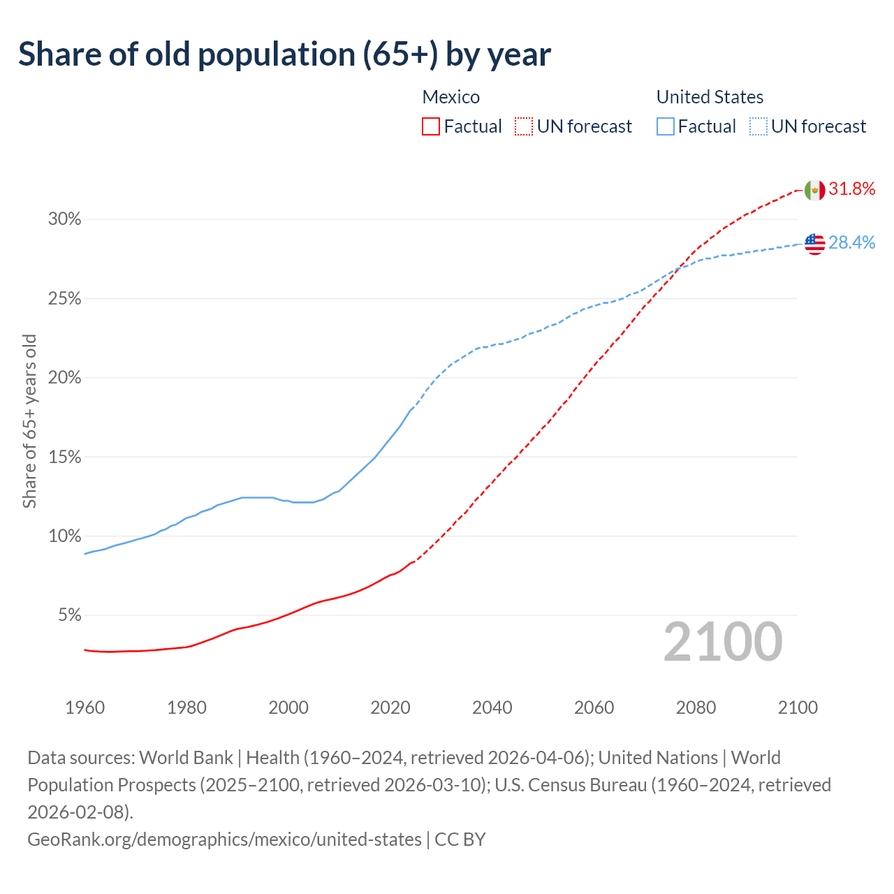 The share of older people aged 65 and over is 8.25% in Mexico and 17.9% in the United States. Life expectancy in Mexico compared to the United States .