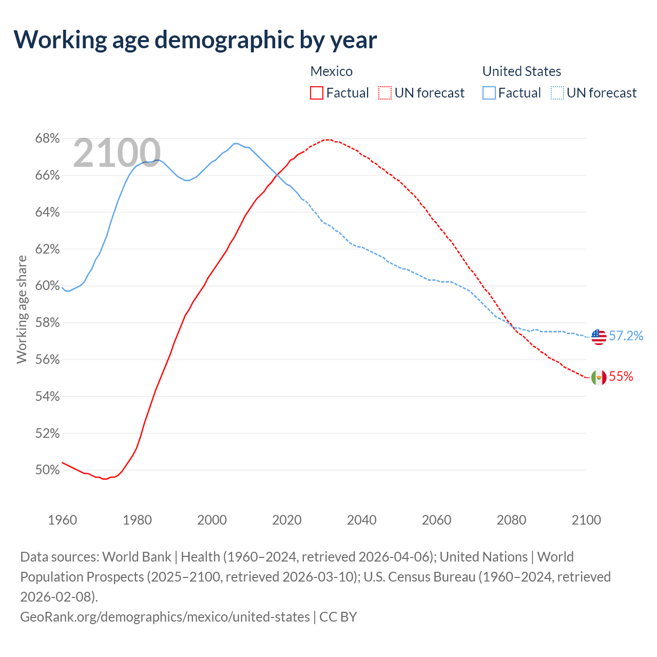 - Mexico has 89.6M working age adults (aged 15-64) vs 223M in the United States.