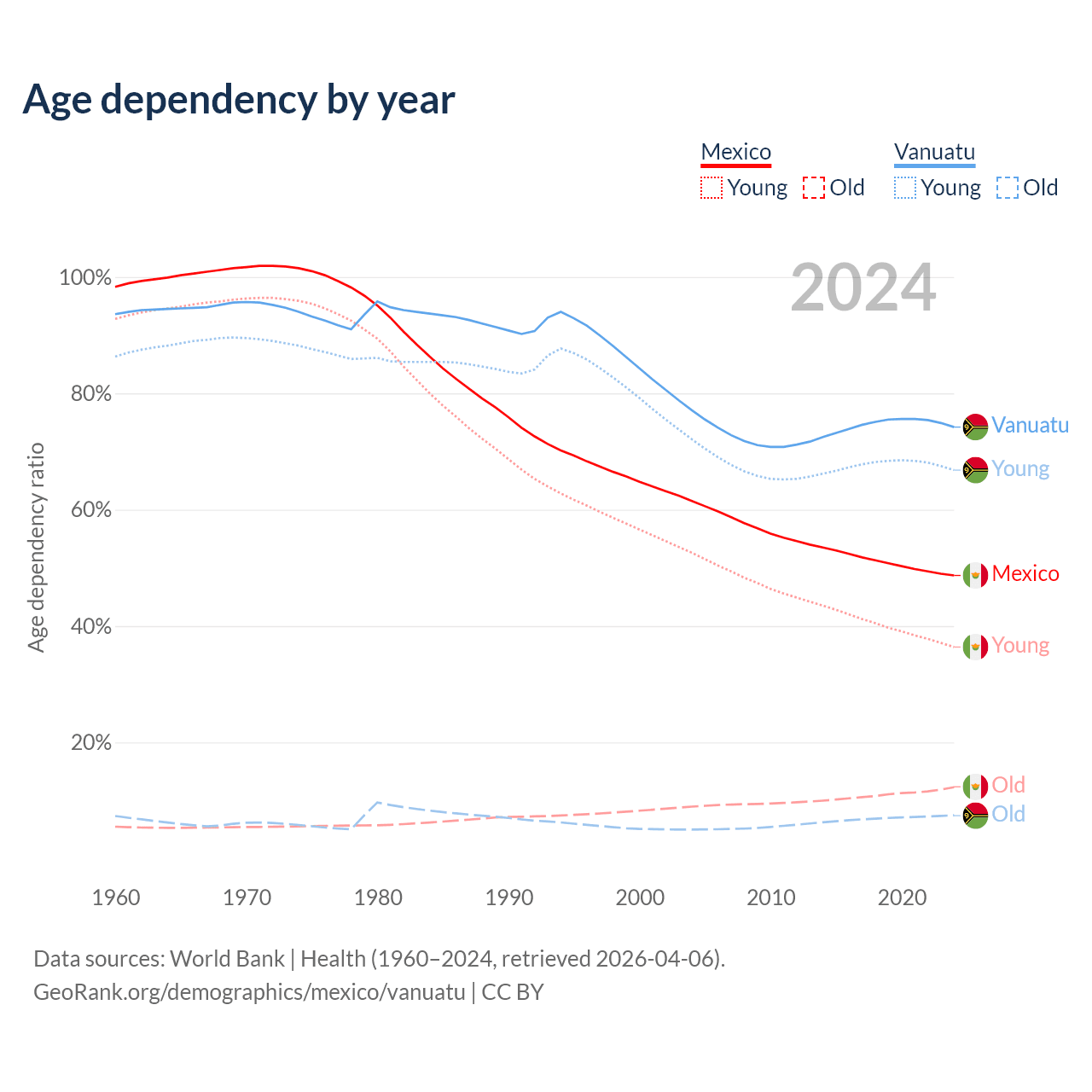 Data sources: World Bank | Health (1960–2024, retrieved 2026-04-06); U.S. Census Bureau (1960–2024, retrieved 2026-02-08).