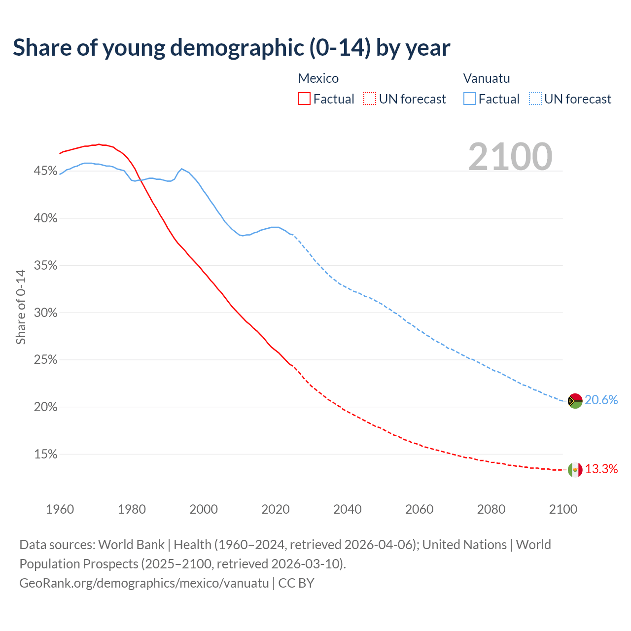 - The share of young demographic (0-15 years old) in Mexico is 24.5% vs 38.3% in Vanuatu.