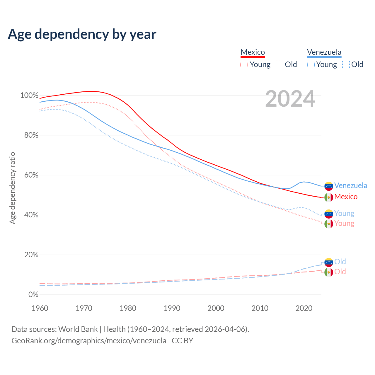 Data sources: World Bank | Health (1960–2024, retrieved 2026-04-06); U.S. Census Bureau (1960–2024, retrieved 2026-02-08).