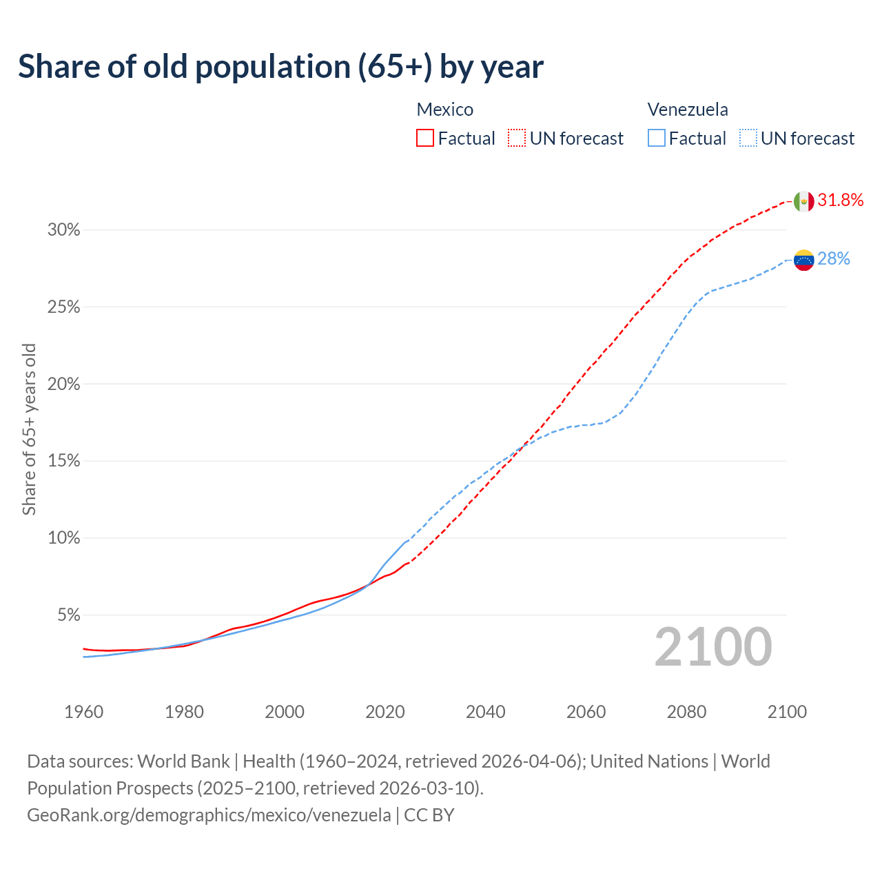 The share of older people aged 65 and over is 8.25% in Mexico and 9.68% in Venezuela. Life expectancy in Mexico compared to Venezuela .