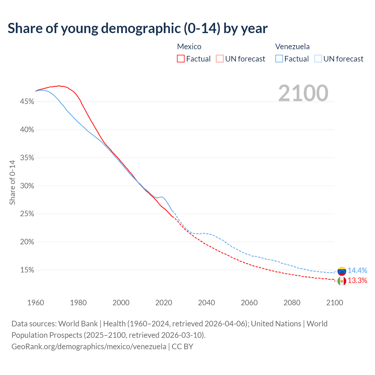 - The share of young demographic (0-15 years old) in Mexico is 24.5% vs 25.5% in Venezuela.