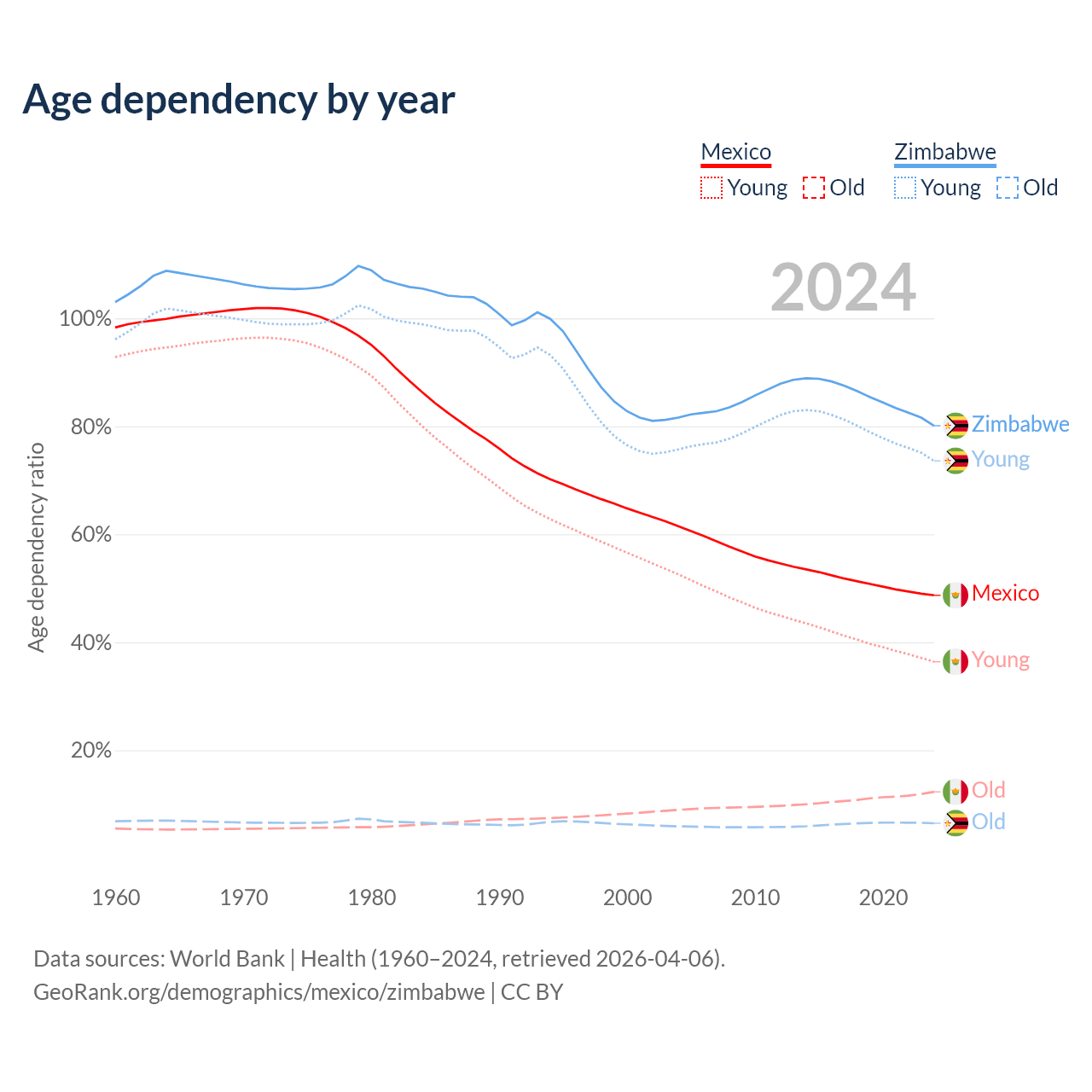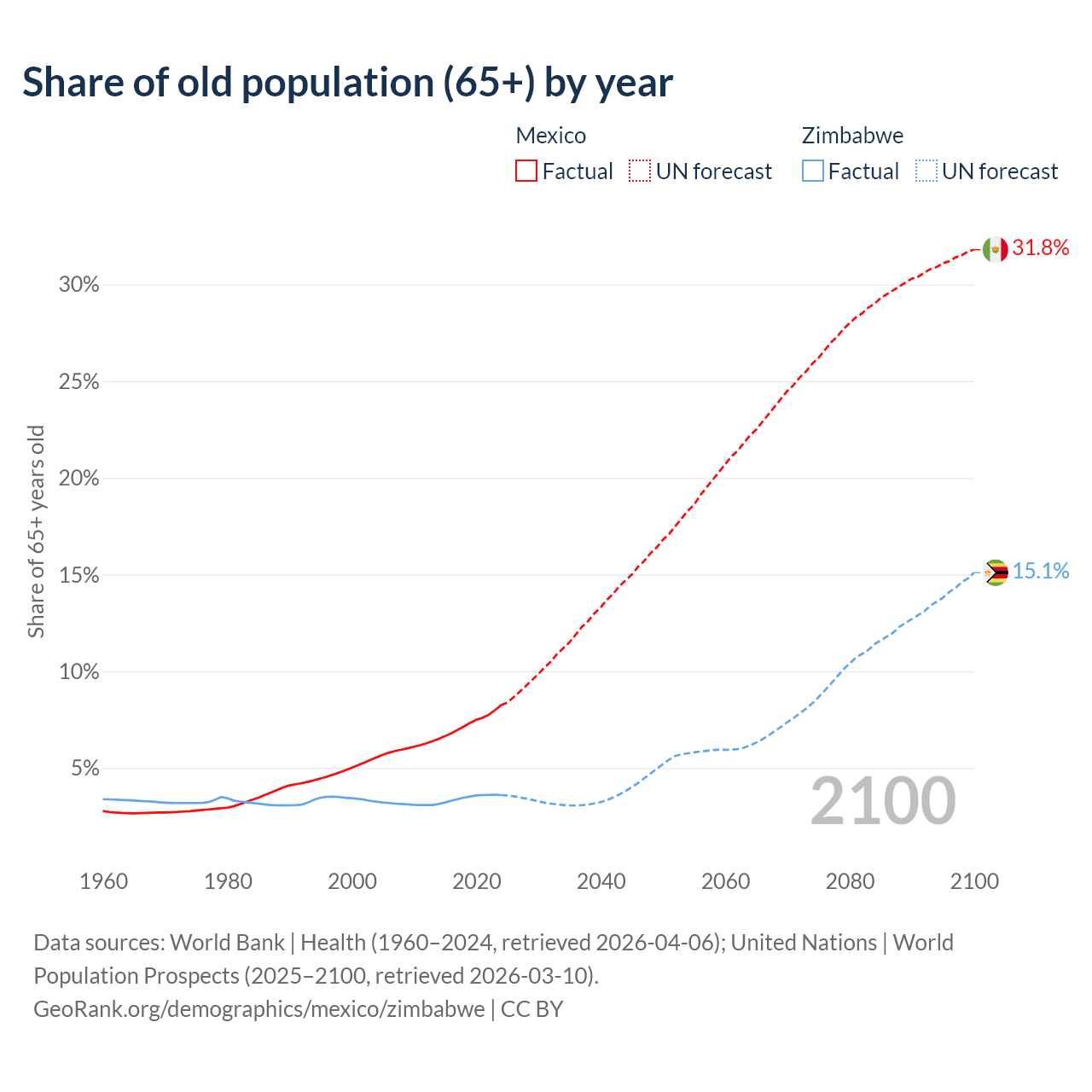The share of older people aged 65 and over is 8.25% in Mexico and 3.6% in Zimbabwe. Life expectancy in Mexico compared to Zimbabwe .