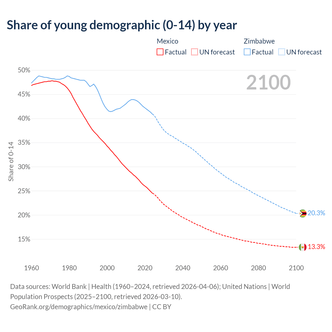 - The share of young demographic (0-15 years old) in Mexico is 24.5% vs 40.9% in Zimbabwe.