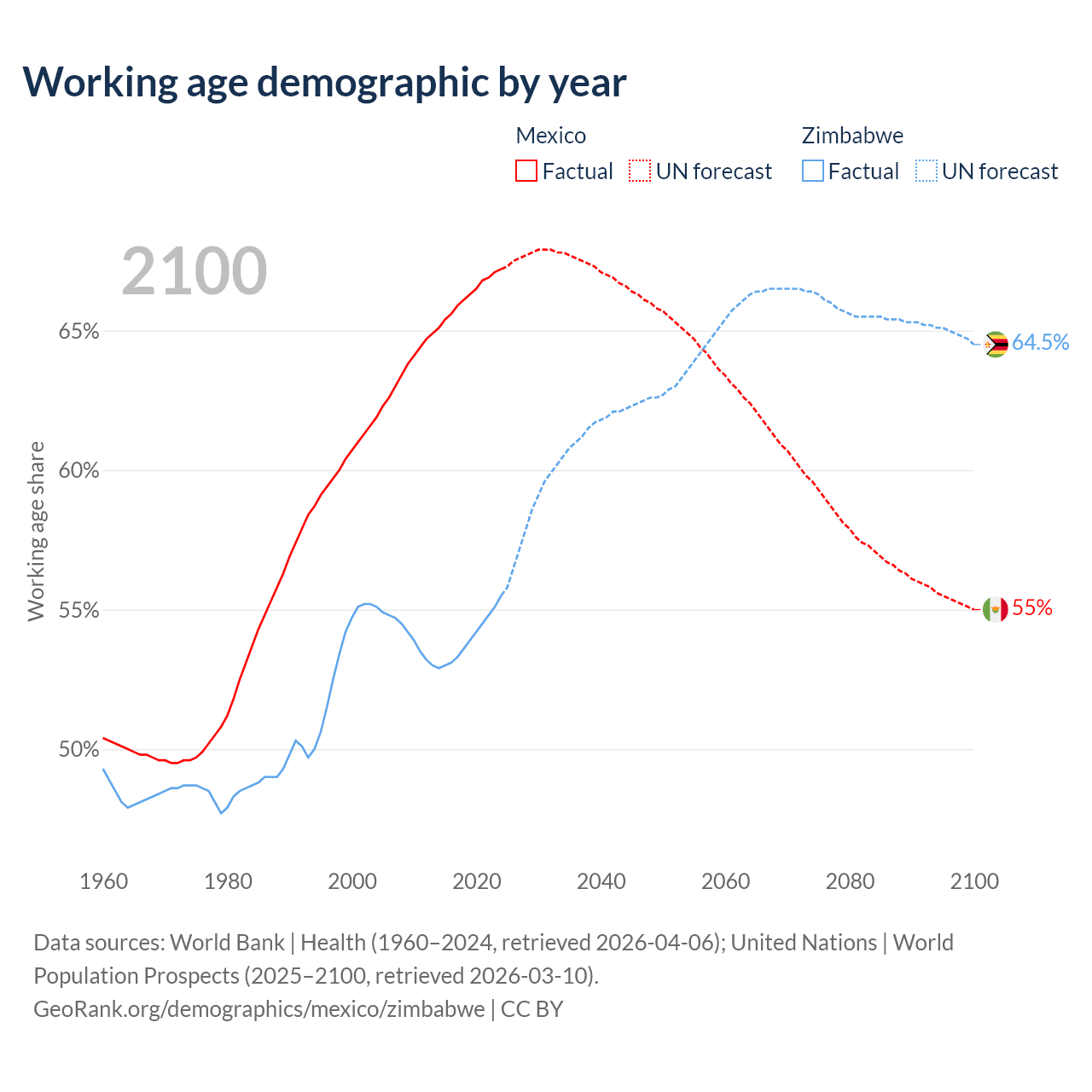 Median age Mexico vs Zimbabwe, 1960-2100