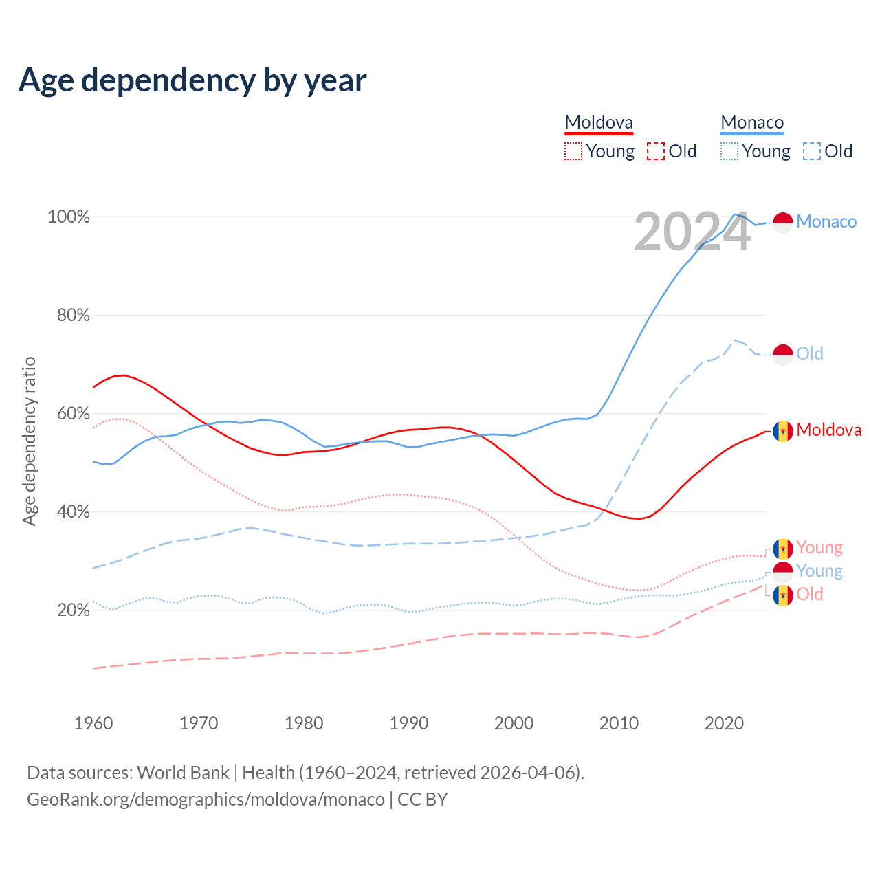 - Moldova is ranked 54/196 by median age (oldest to youngest) vs 1/196 for Monaco.
