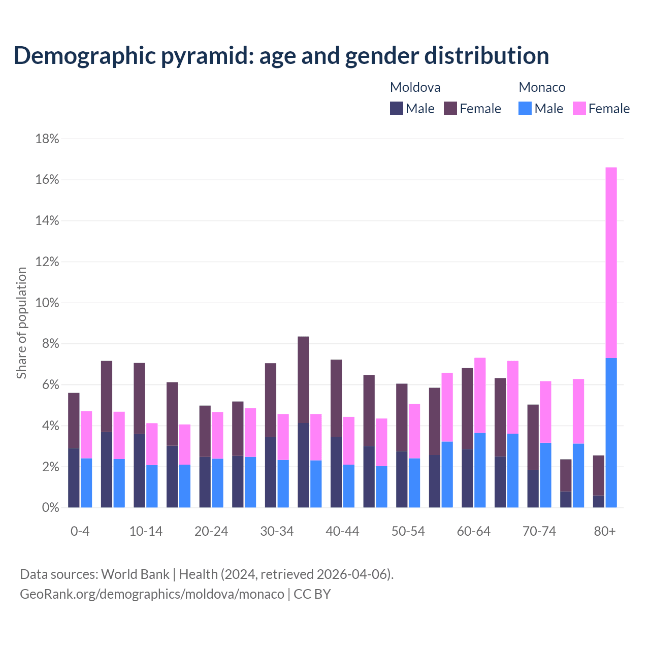 - The share of old-age demographic (65+) in Moldova is 16.2% vs 36.2% in Monaco.