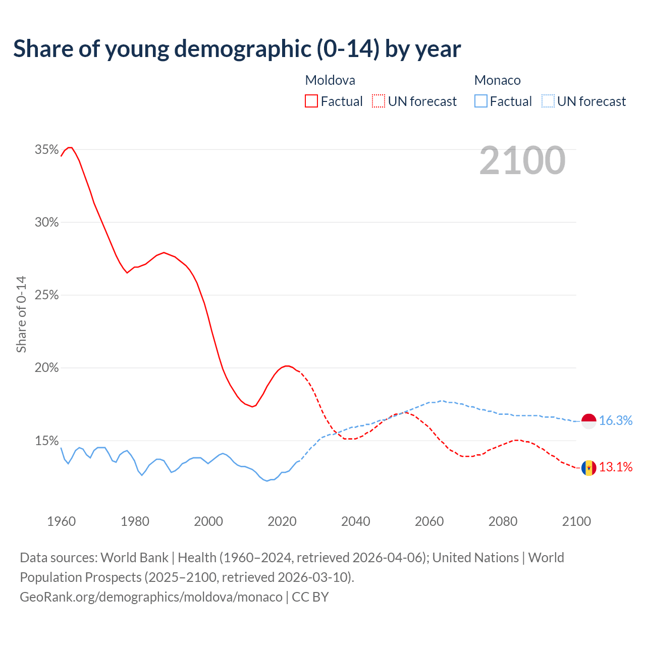 - The share of young demographic (0-15 years old) in Moldova is 19.8% vs 13.5% in Monaco.