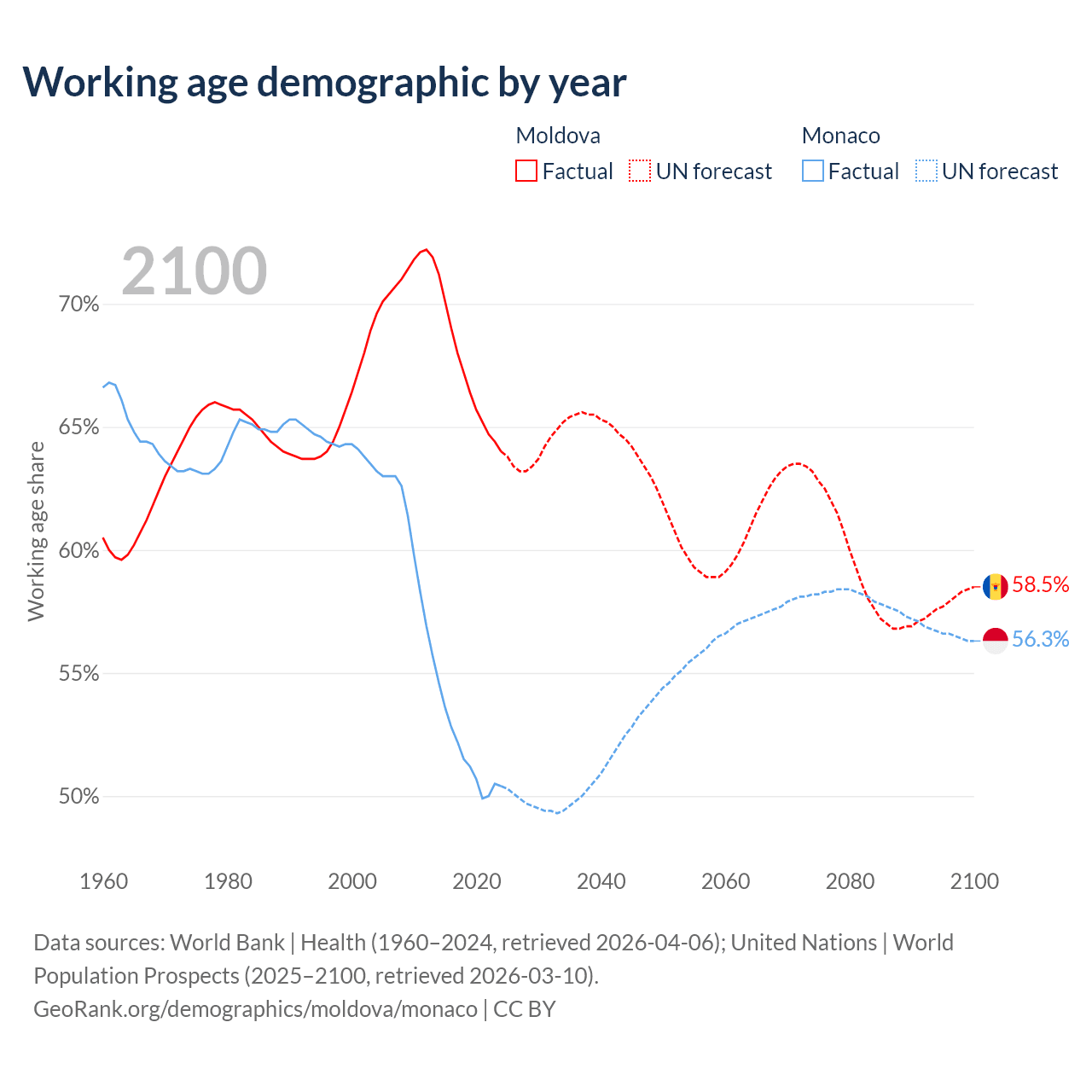 Median age Moldova vs Monaco, 1960-2100