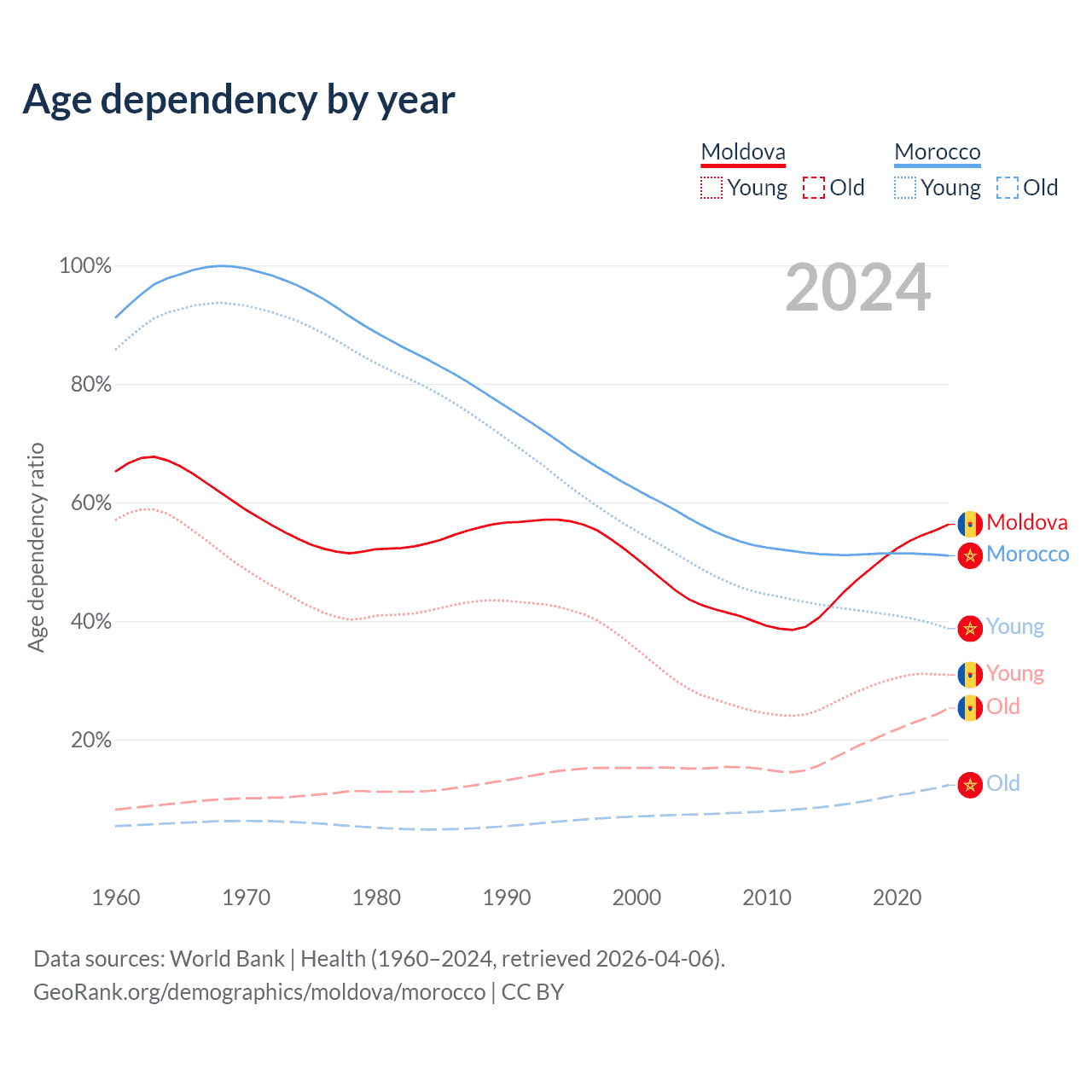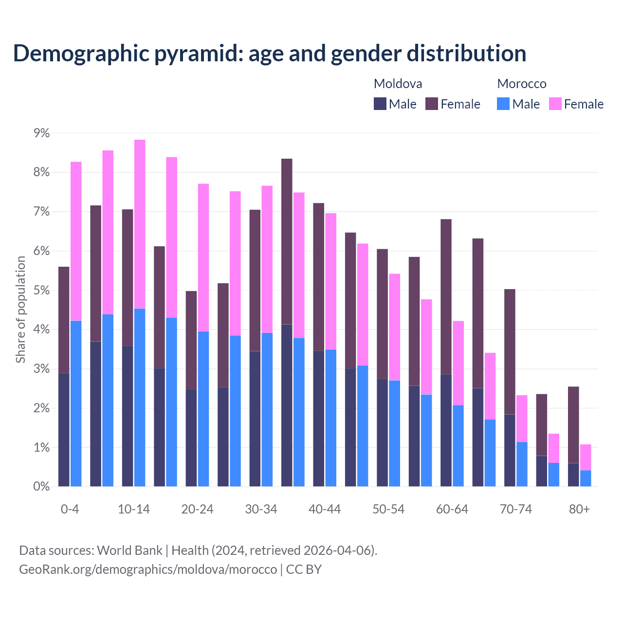 - Moldova is ranked 54/196 by median age (oldest to youngest) vs 100/196 for Morocco.