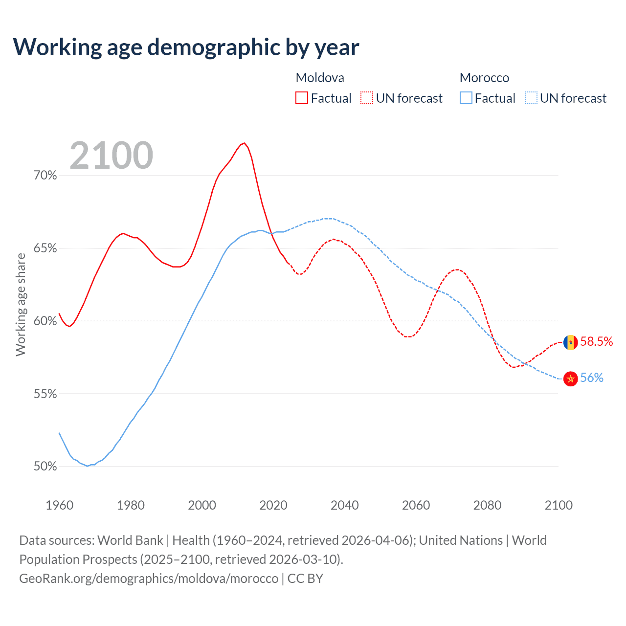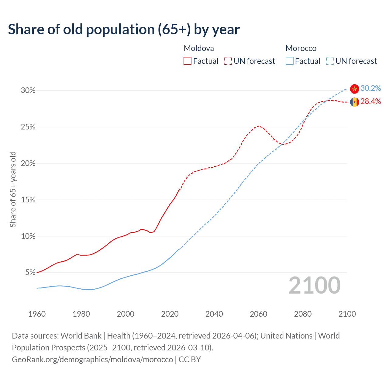 Median age Moldova vs Morocco, 1960-2100
