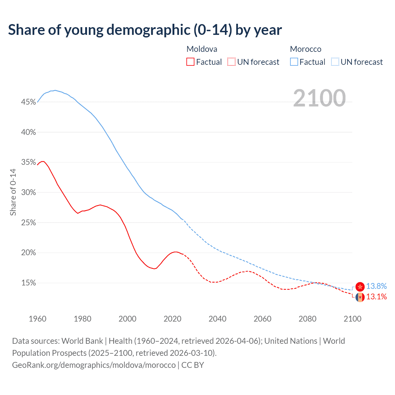 - The share of young demographic (0-15 years old) in Moldova is 19.8% vs 25.6% in Morocco.