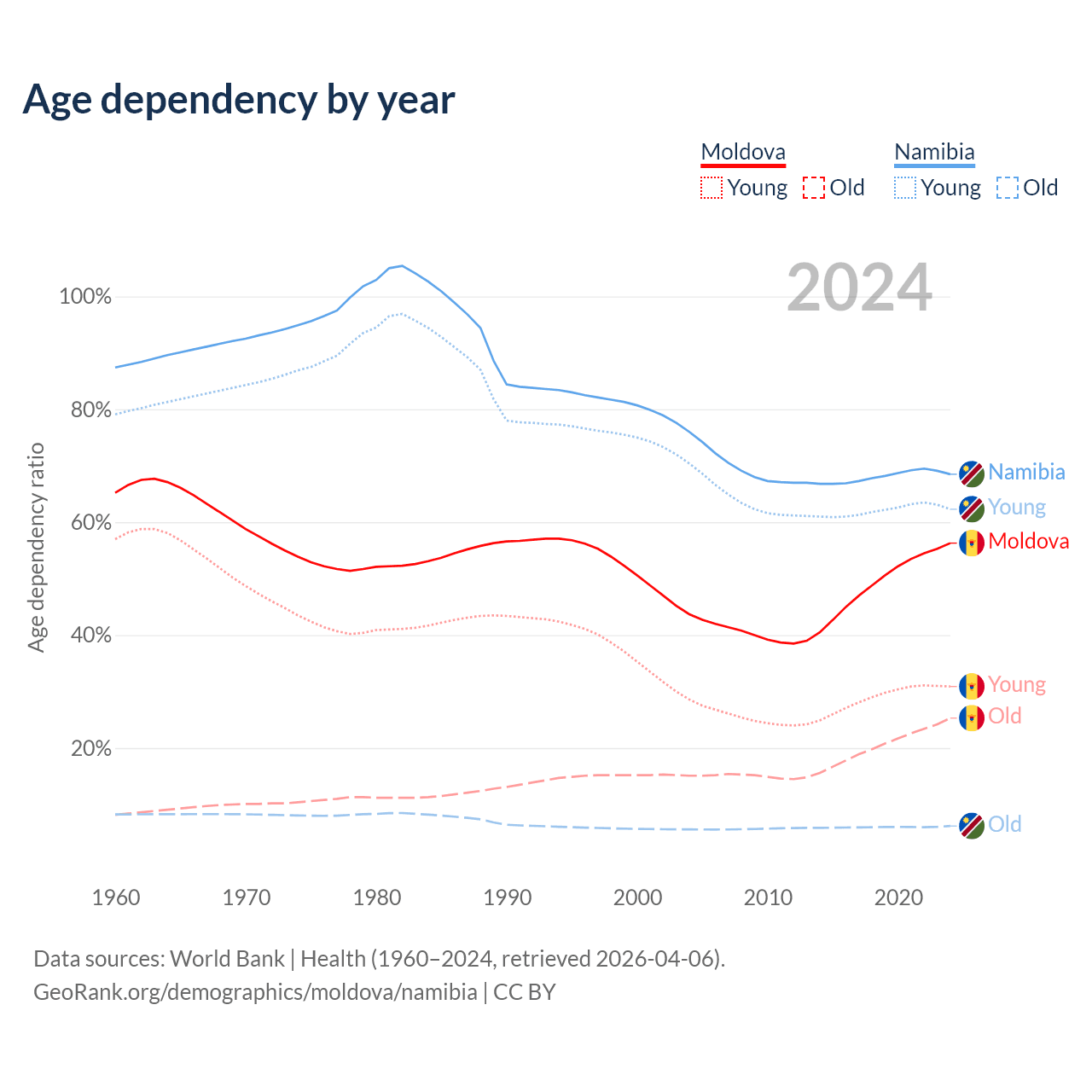- Moldova is ranked 54/196 by median age (oldest to youngest) vs 147/196 for Namibia.