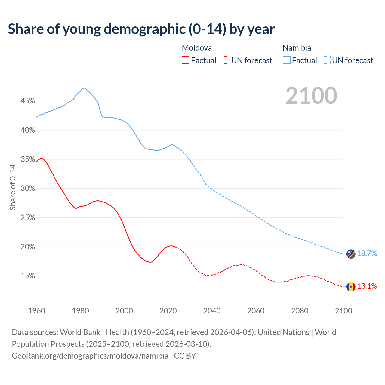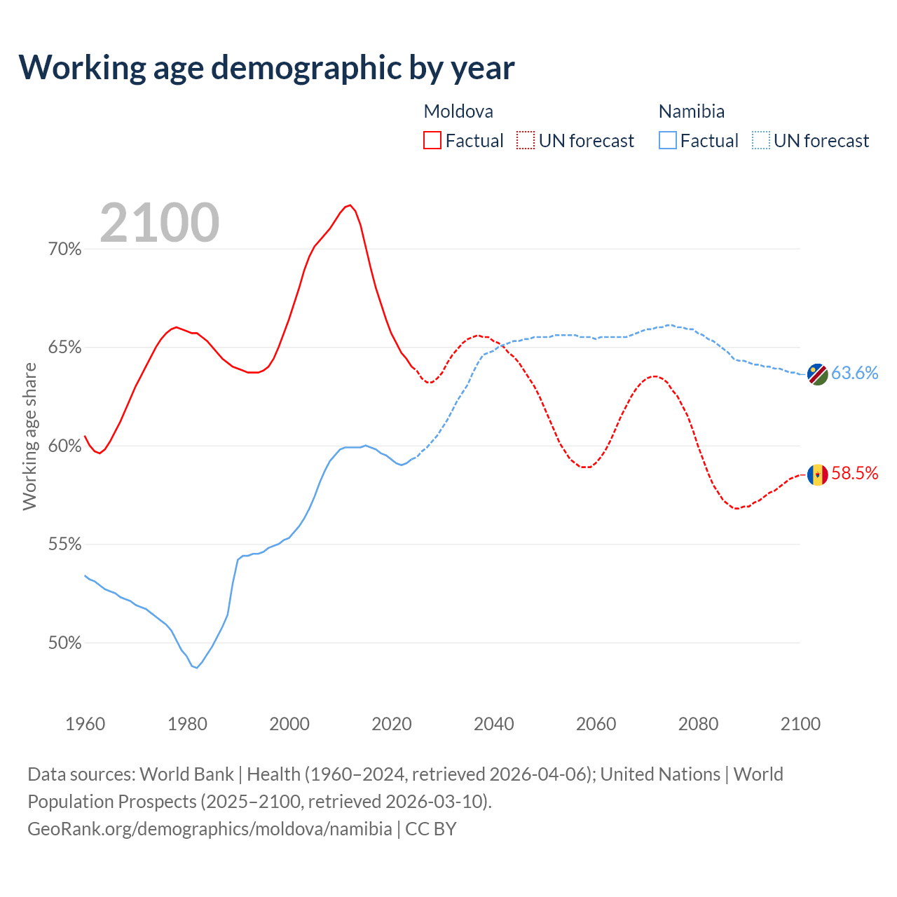Median age Moldova vs Namibia, 1960-2100