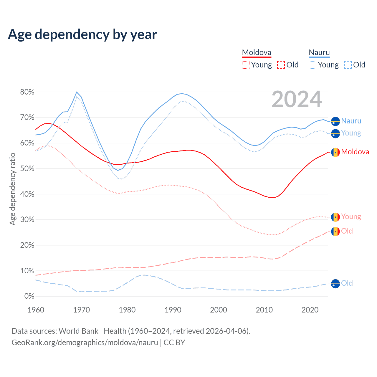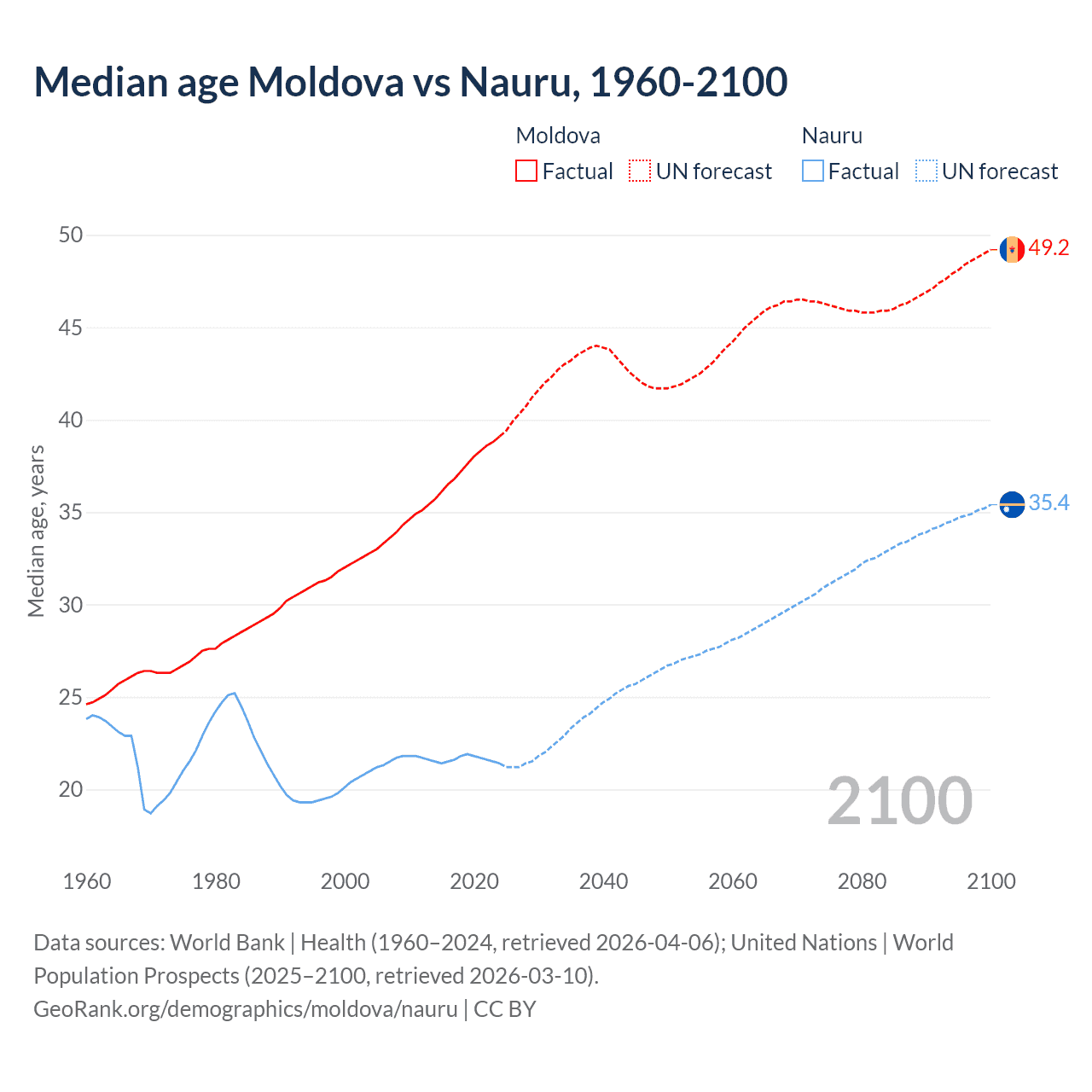 - Moldova is ranked 54/196 by median age (oldest to youngest) vs 155/196 for Nauru.