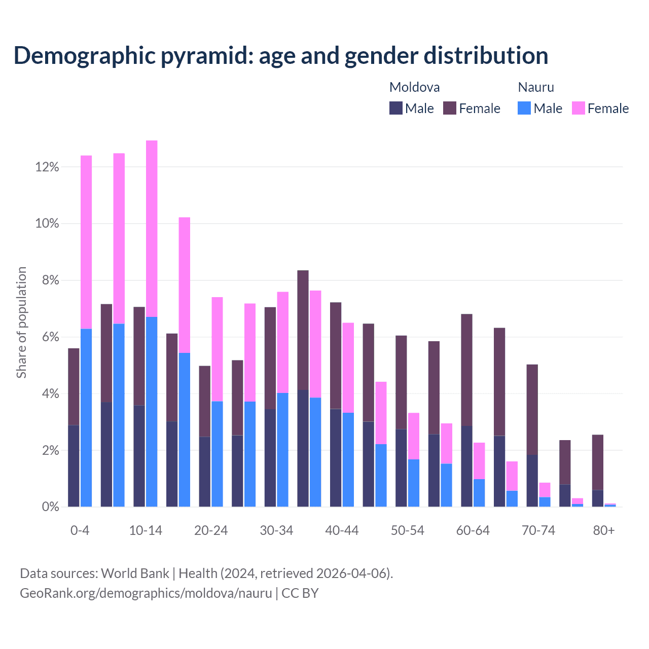 - As of 2026, the population of Moldova is 2.34M vs 12.1K in Nauru - 193.1 times difference.
