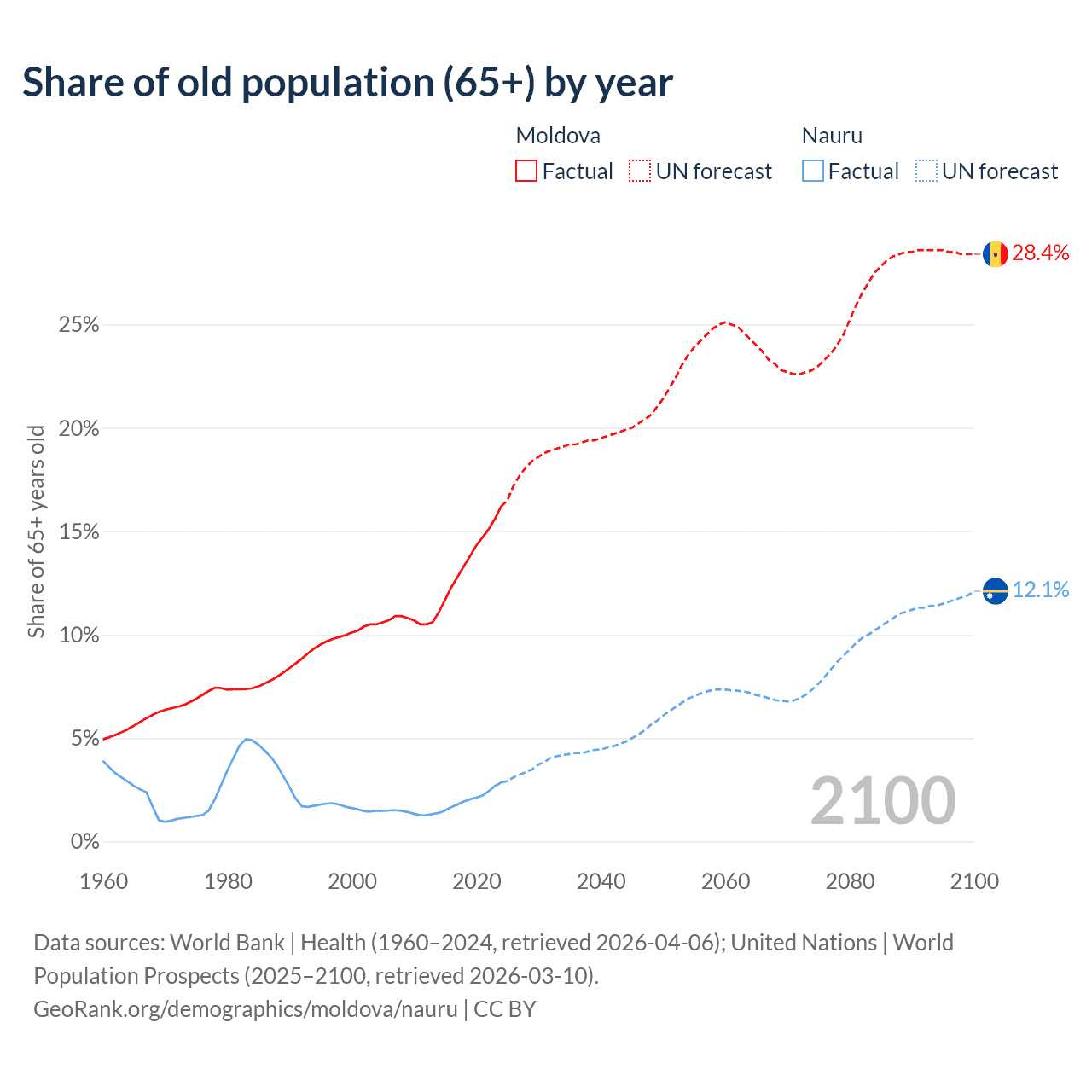 The share of older people aged 65 and over is 16.2% in Moldova and 2.85% in Nauru. Life expectancy in Moldova compared to Nauru .