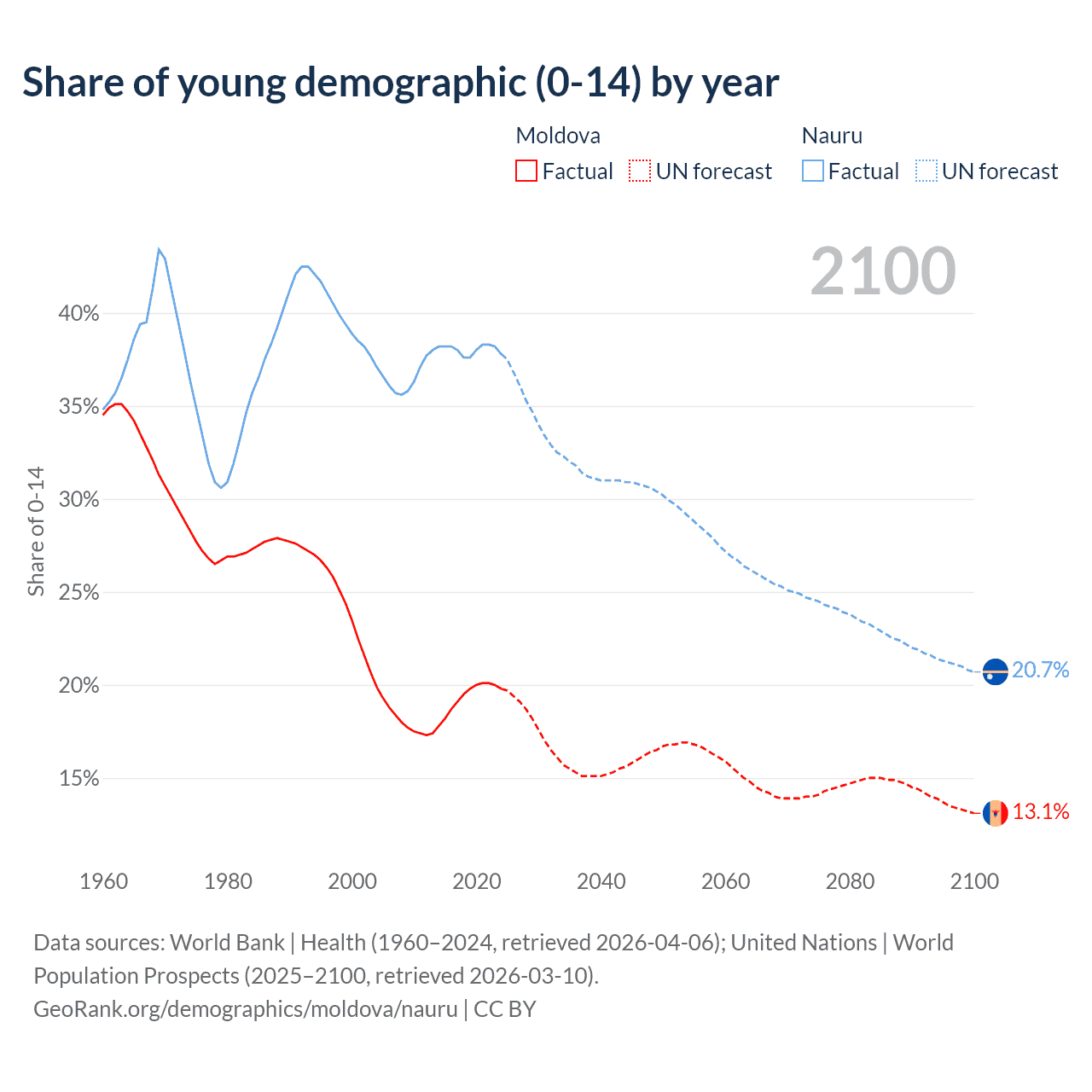 - The share of young demographic (0-15 years old) in Moldova is 19.8% vs 37.8% in Nauru.