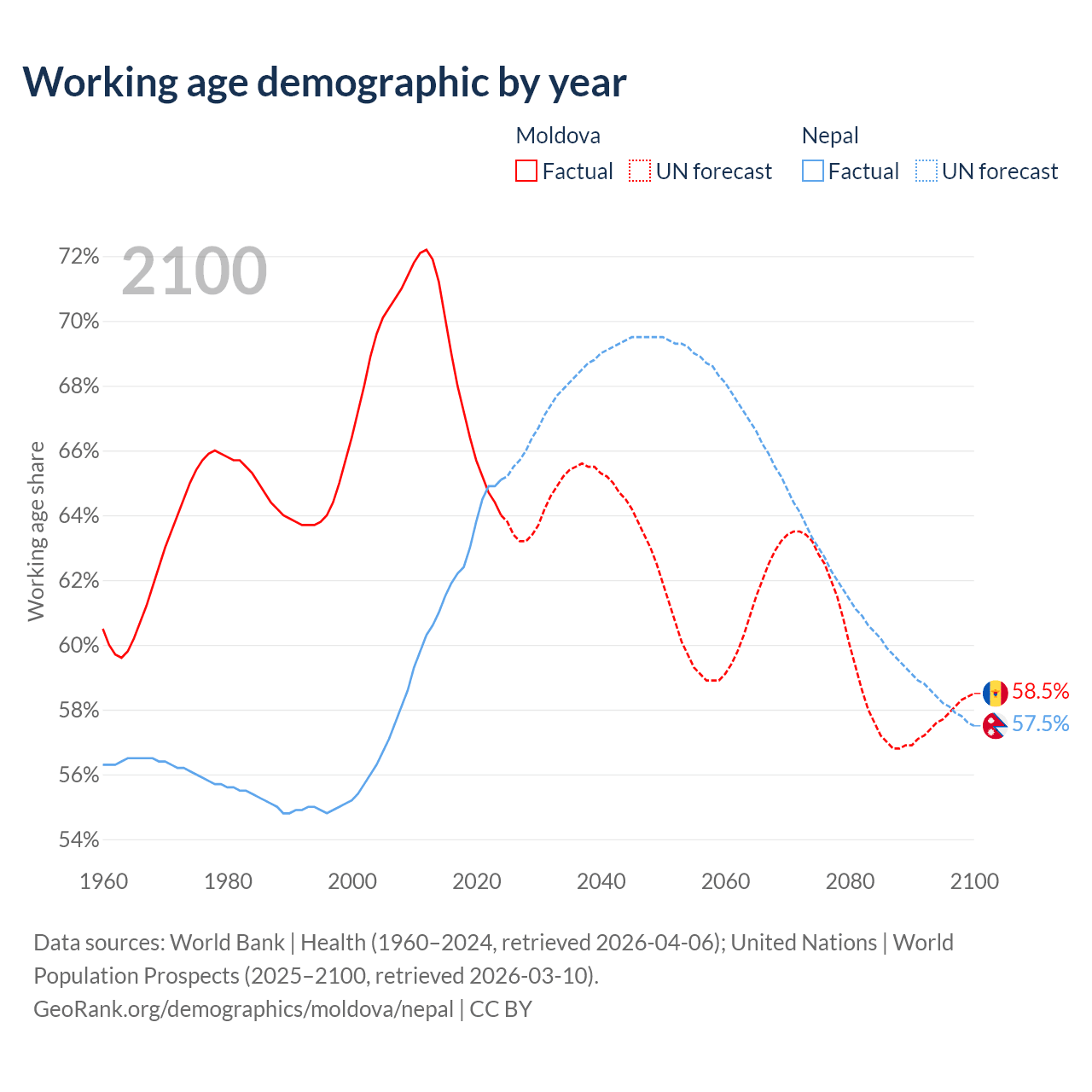 Median age Moldova vs Nepal, 1960-2100