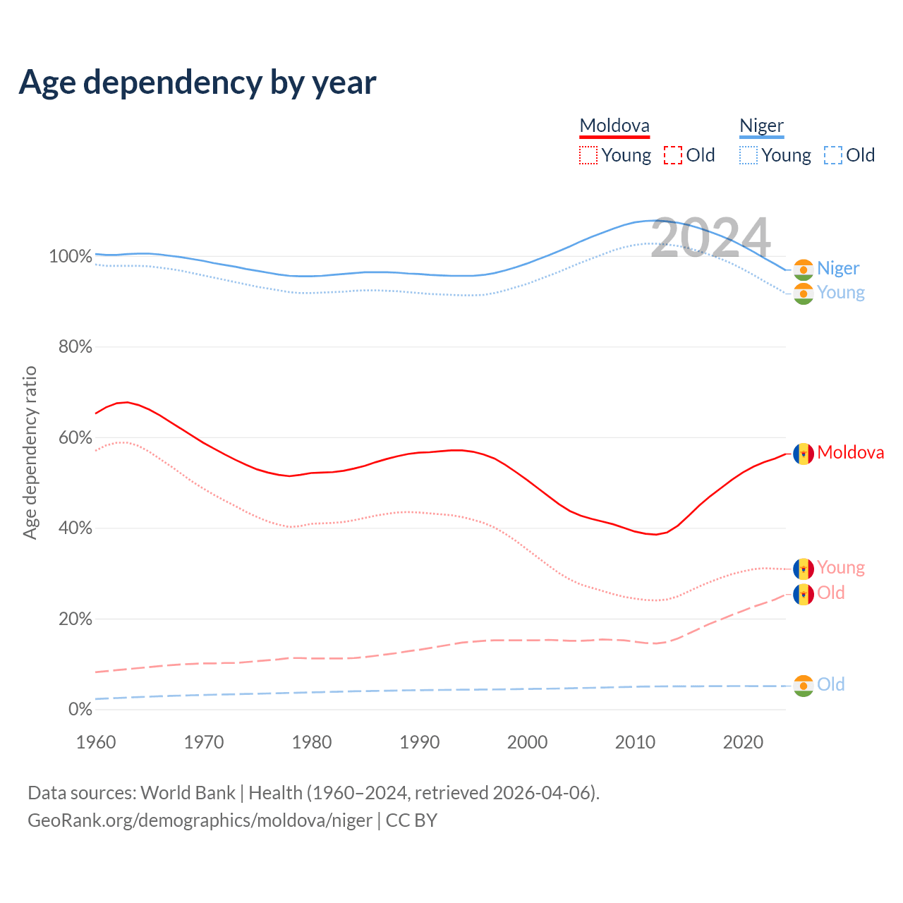 - The share of old-age demographic (65+) in Moldova is 16.2% vs 2.59% in Niger.